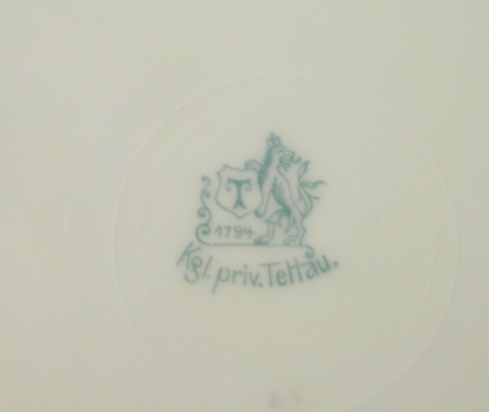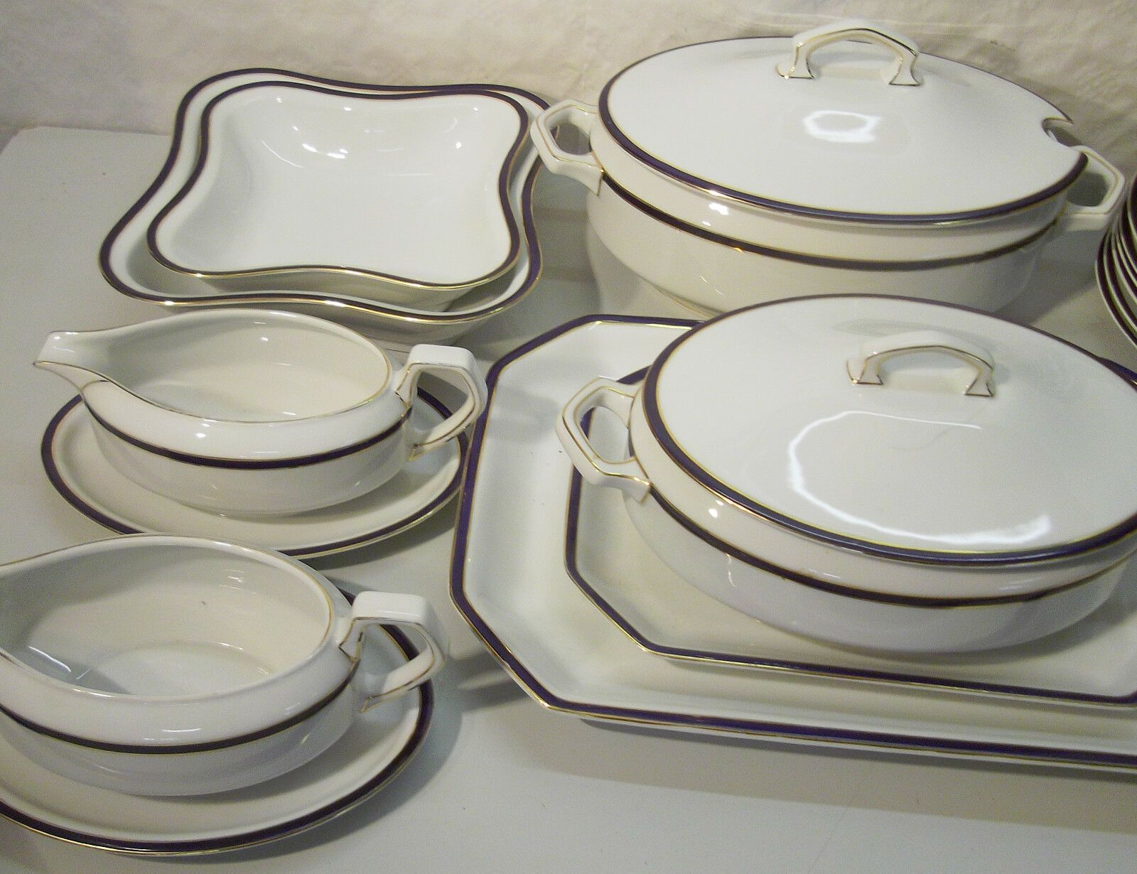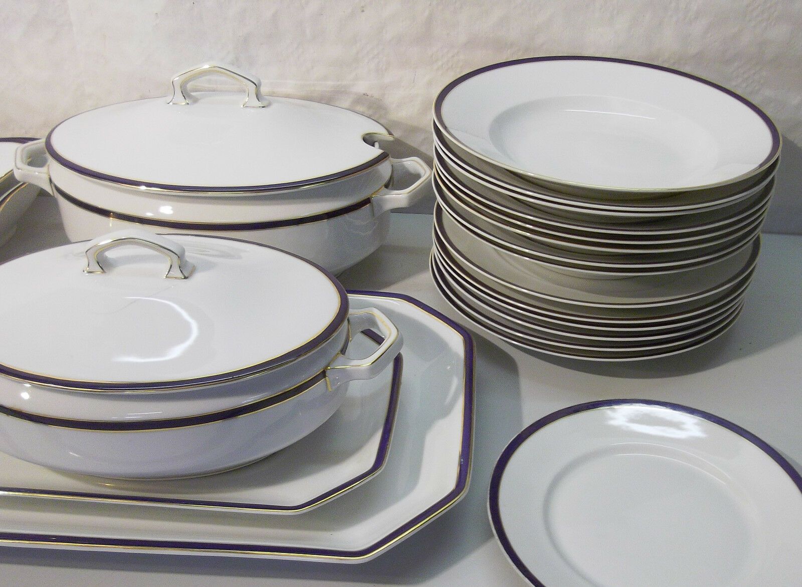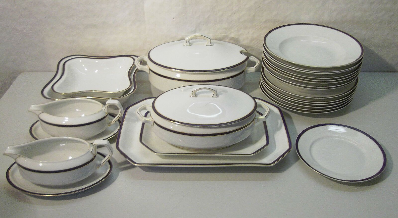 Speise-Service um 1950 . Marke: Royal Tettau (siehe Foto). Material: Porzellan mit blauem und goldenem Rand. Bestehend aus 25 Teilen: 2 Vorlege-Platten, 2 offene Schalen, 2 Deckel-Schüsseln, 2 Saucieren, 1 Kuchenteller, 6 Essteller, 8 Suppenteller. Der Deckel der kleineren Schüssel hat einige Haarri