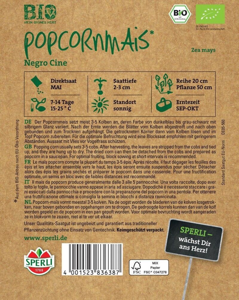 Sperli Sperli BIO Popkornmais, sehr gesunde und standfeste Sorte die einen