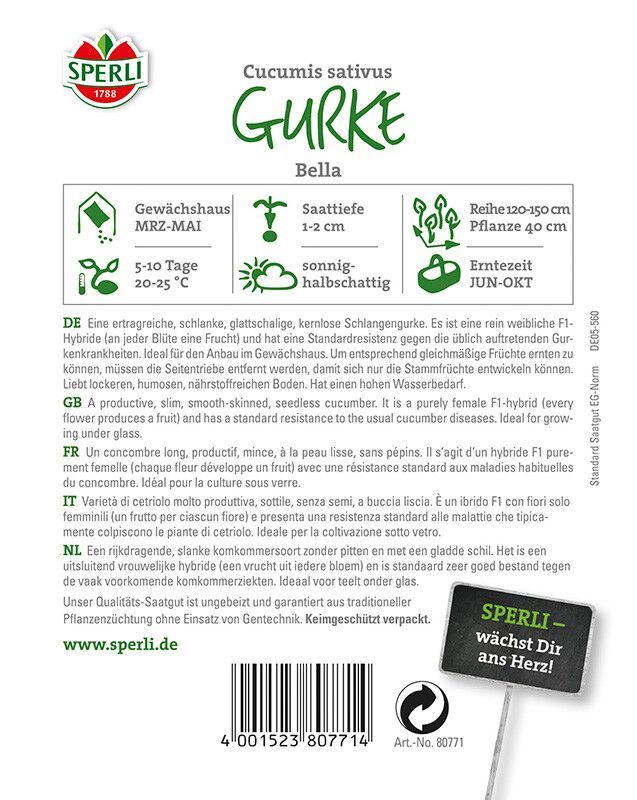 Gurke - Bella F1 Hybride Sperli Gurke - Bella F1 Hybride, kiepenkerl, fachversand, samen, pflanzen, samenshop24, samenversand, saat, versand, blumensamen, bio, saatgut, rein weiblich, 41621, 334258 resistente-tolerante-Sorten
