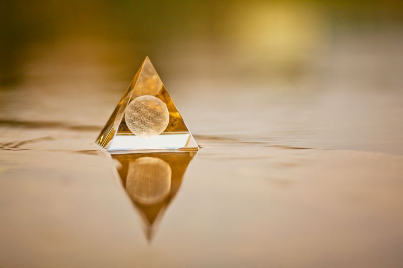 Sphärenkristall Pyramide BLUME DES LEBENS 10 x 10 cm LED-Untersetzer Geschenkbox