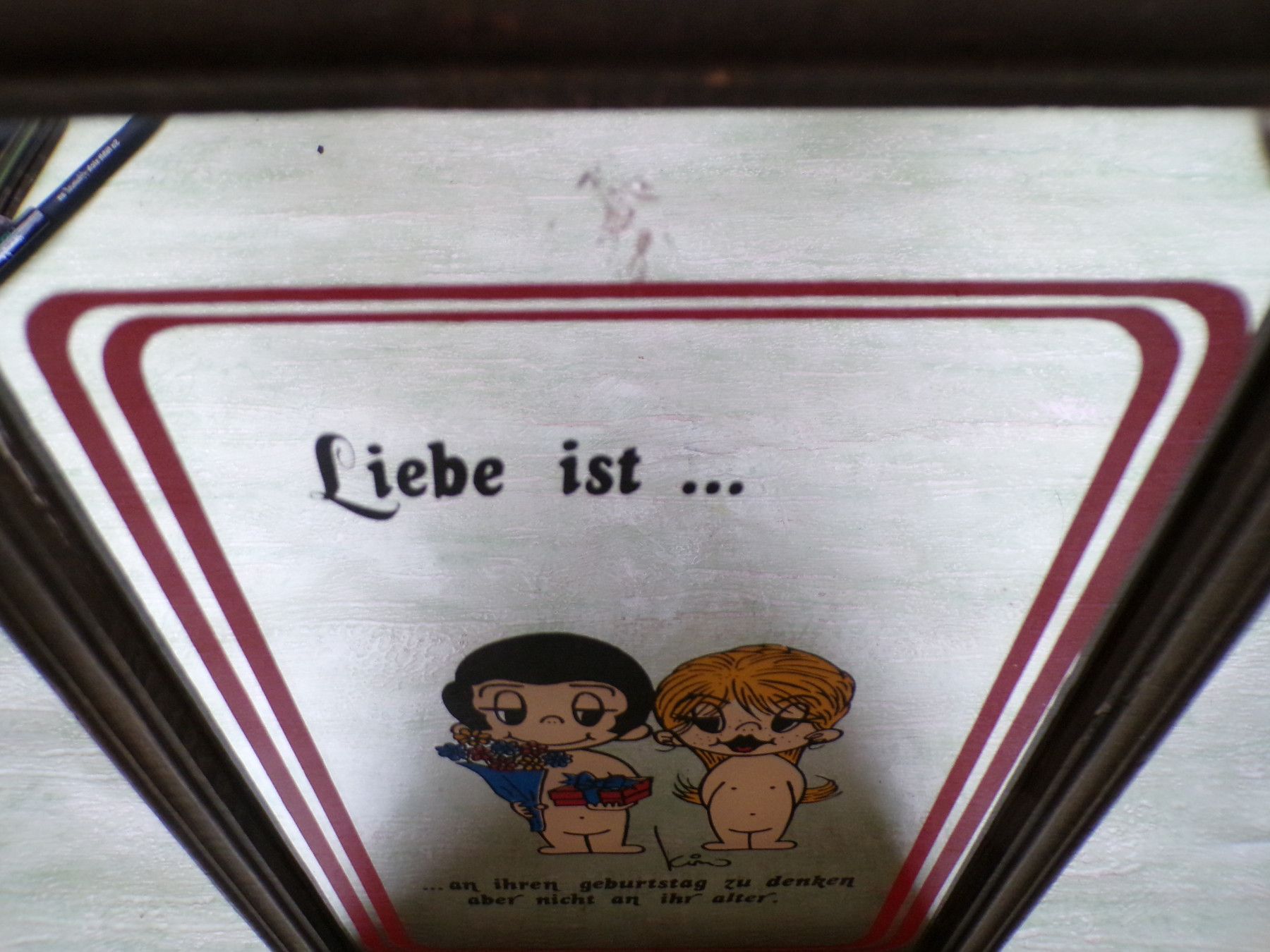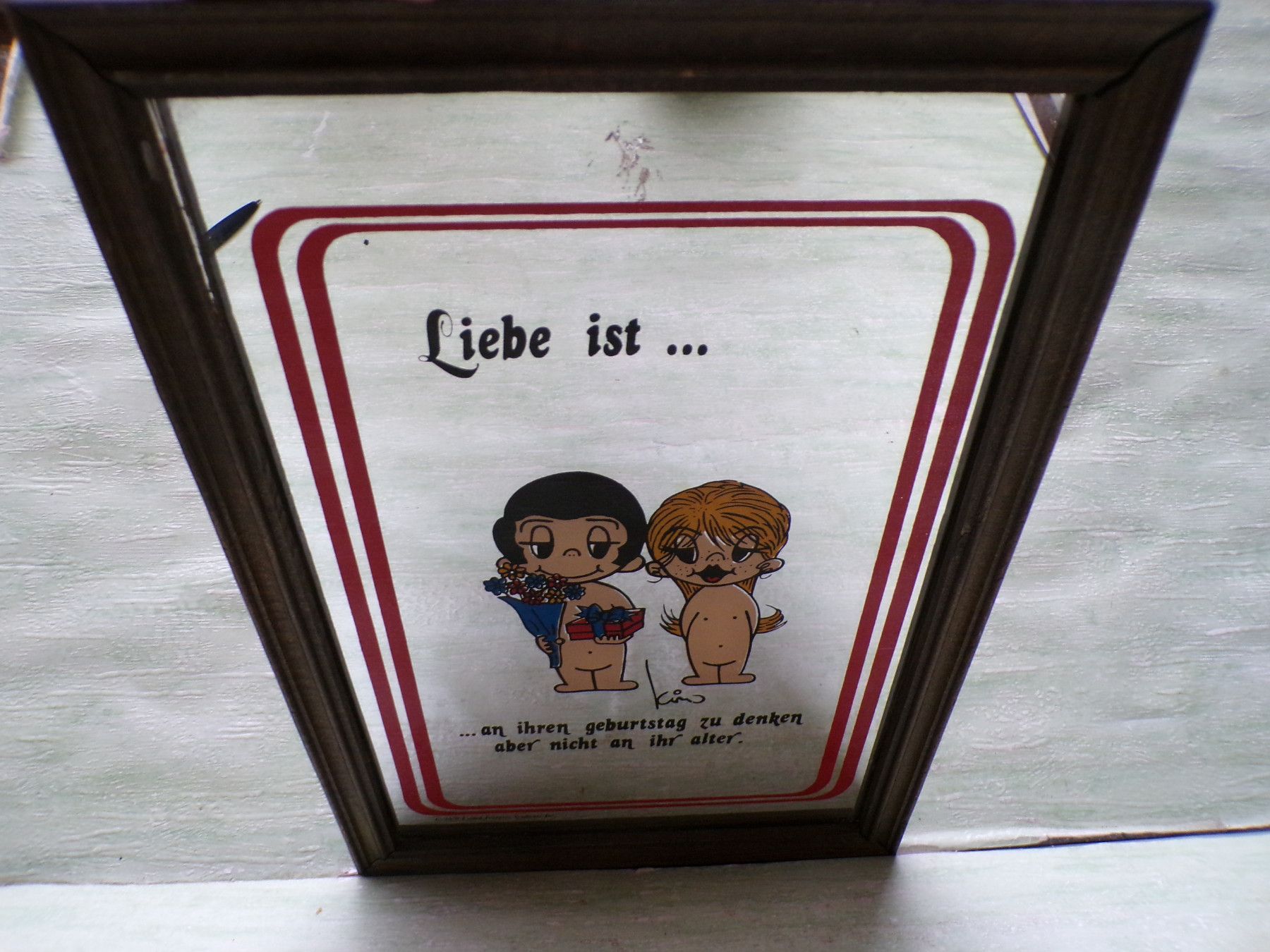 ... Erinnerungen ..... . alter Liebe ist Kim Spiegel ...an Ihren Geburtstag zu denken , aber nicht an Ihr Alter original alt ! RAR ca 34 x 23,5 cm . Zustand : oben mittig im Spiegel ein Fleck , eine Rahmenecke gelockert, ansonsten unbeschädigt . . . Fotos sind Bestandteil der Beschreibung Bitte berü
