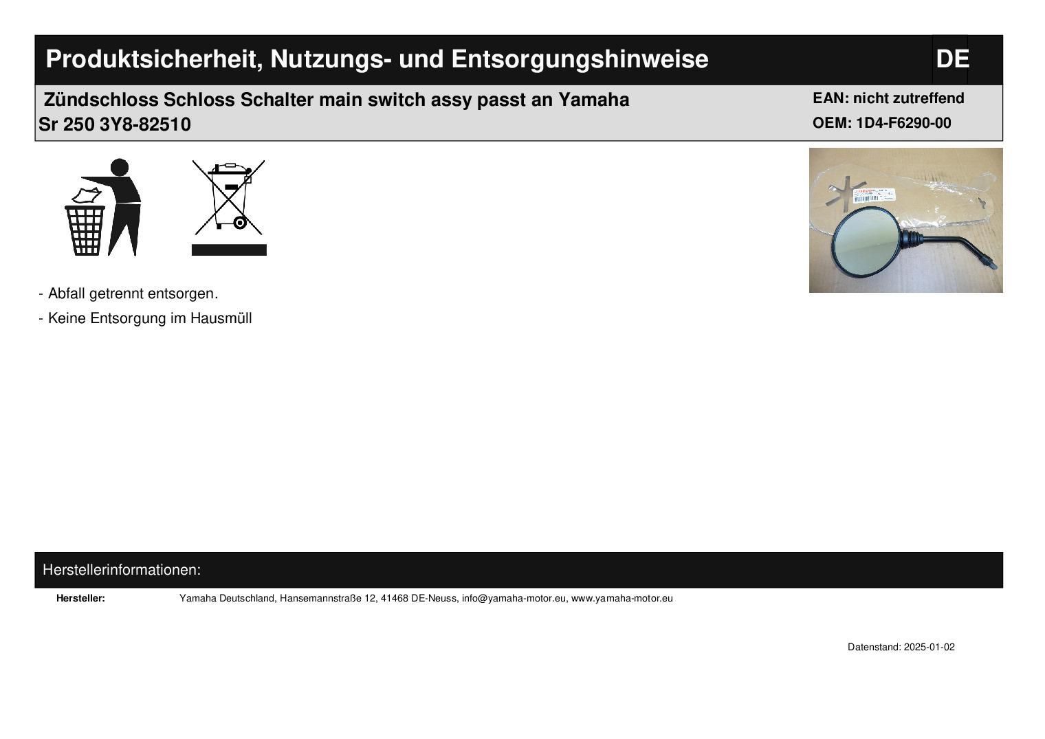 Zündschloss Schloss Schalter main switch assy passt an Yamaha Sr 250 3Y8-82510 In dieser Auktion gibt es folgenden Artikel zu kaufen: Spiegel links (siehe Foto) Modell: passend für Yamaha XT 125, XT 125 R, XT 125 X Bj.: 2005 - 2010 Lieferumfang: siehe Foto Artikelzustand: neu aus Geschäftsauflösung,