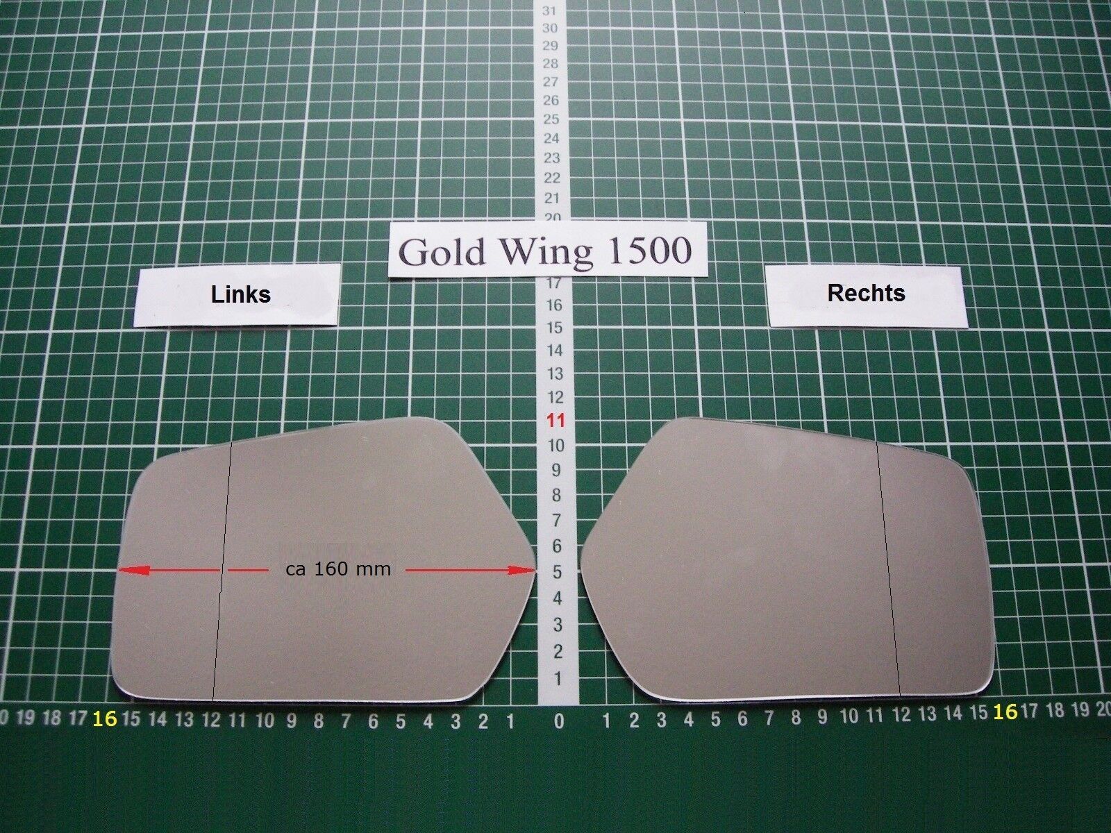 Autospiegelglastechnik Wir bieten ein Spiegelglas Ersatzglas für Motorrad Honda Gold Wing - 1500 mit ein Toter Winkel Achtung ; Grosse Ersatzglas ca 160 mm Breit Unsere Hood Bild bitte vergrossern und vergleichen Vor ihrer Kaufentscheidung vergleichen Sie bitte die Maßen und entscheiden Sie dann bit
