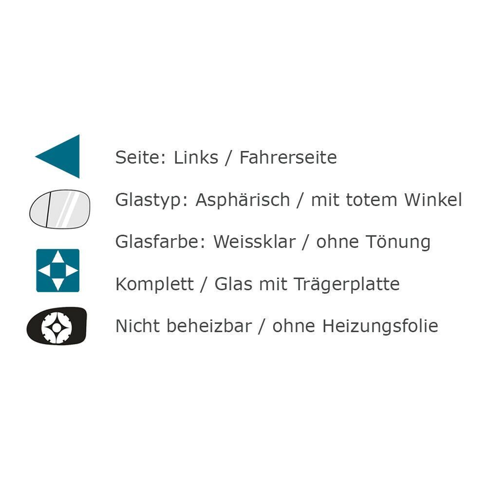 Ersatzspiegel passend für: OPEL AGILA B 2008-2015 Seite: Links Fahrerseite Glastyp: Asphärisch mit totem Winkel Glasfarbe: Weissklar ohne Tönung Komplett Glas mit Trägerplatte Ohne Heizung Nicht beheizbar