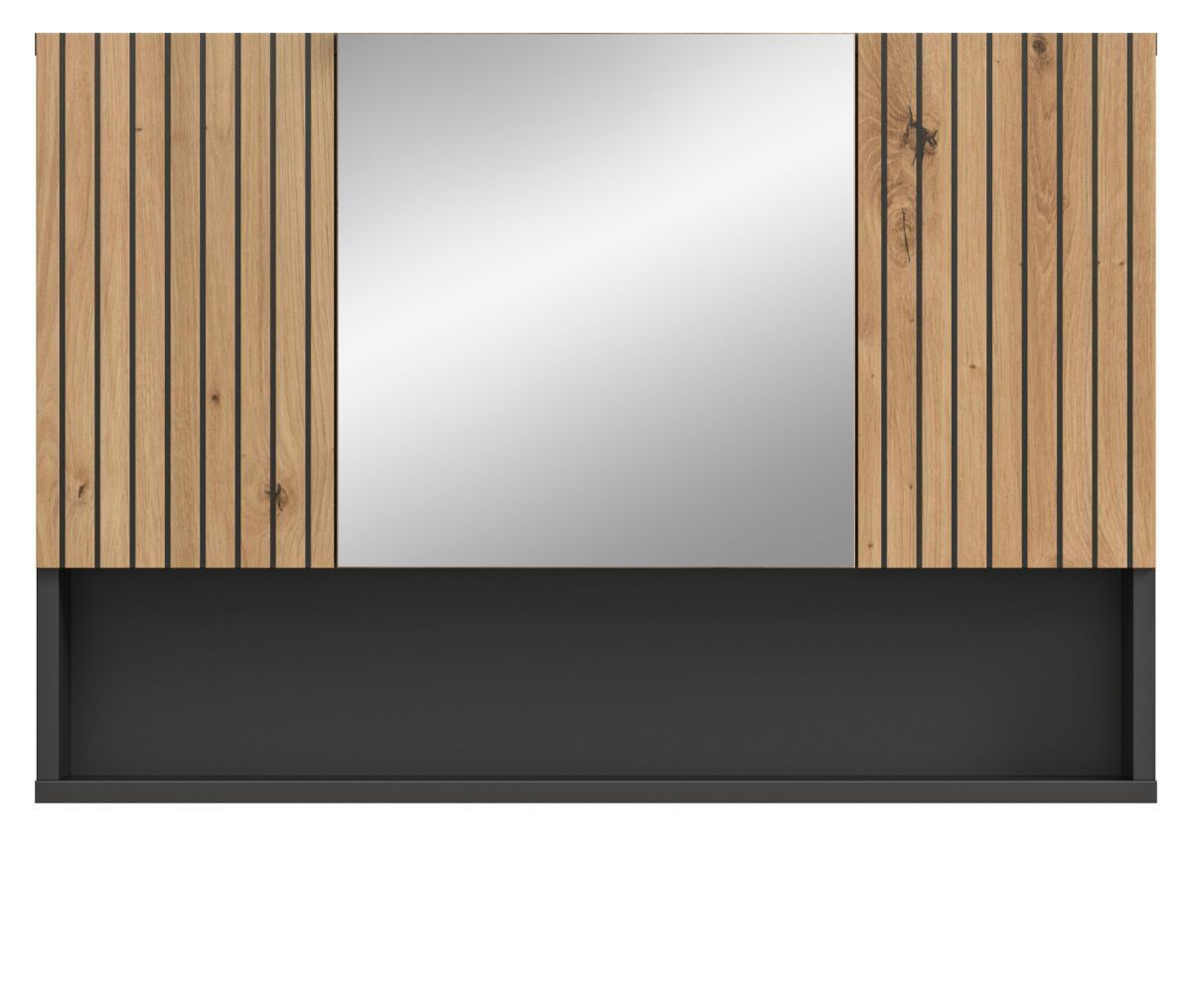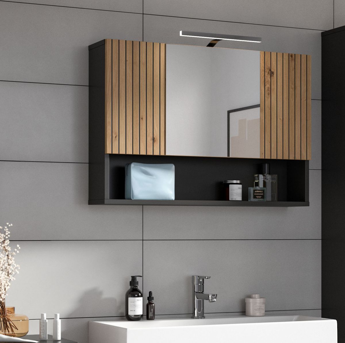 Spiegelschrank Bad 80 cm Eiche Artisan Grau Badmöbel Spiegel 7 Fächer LED Livia