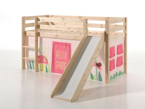 VIPACK Spielbett Hochbett Kinderbett 90x200 Rutsche Vorhang Rosa Blumen Holzbett Natur
