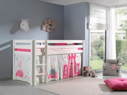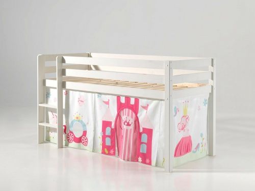 VIPACK Spielbett Hochbett Kinderbett 90x200 Vorhang Prinzessin Weiß Rosa Holzbett Pink
