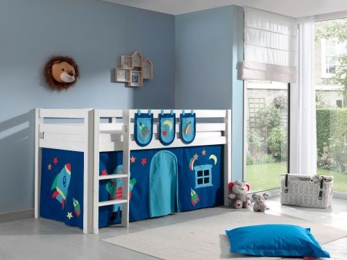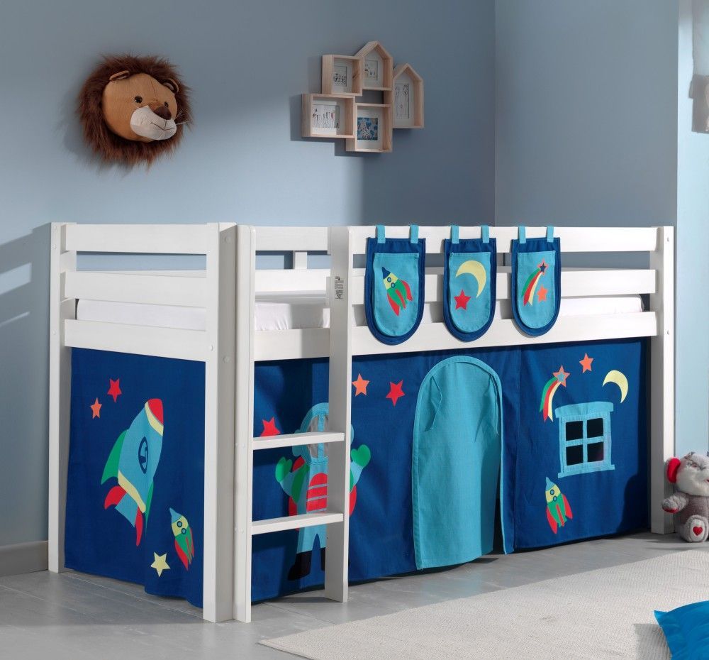 VIPACK Spielbett Hochbett Kinderbett 90x200 Vorhang Taschen Astronaut Weltall Holzbett