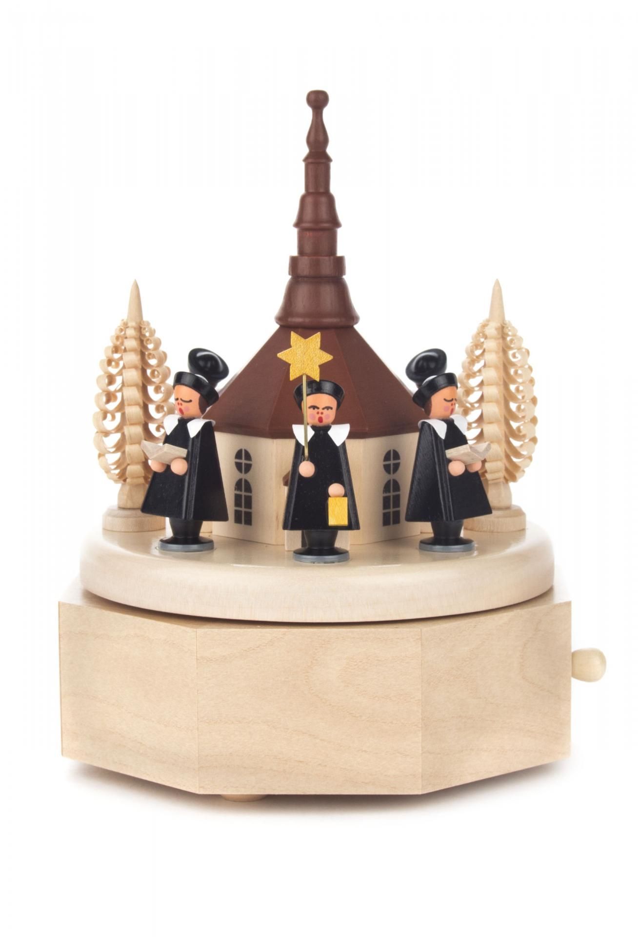 Spieldose mit Seiffener Kirche und Kurrende, Figuren schwarz Melodie Stille Nacht