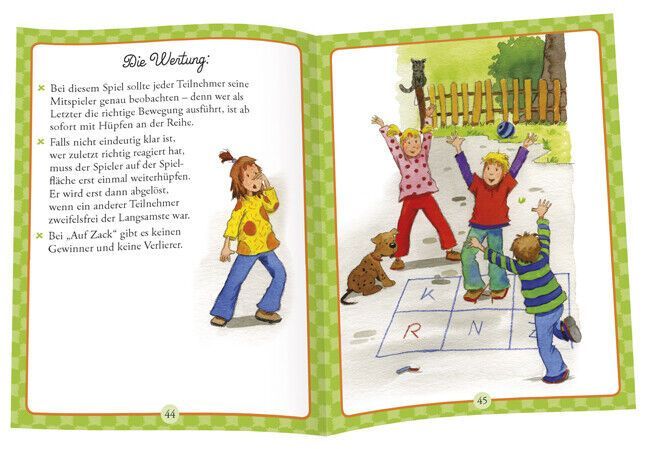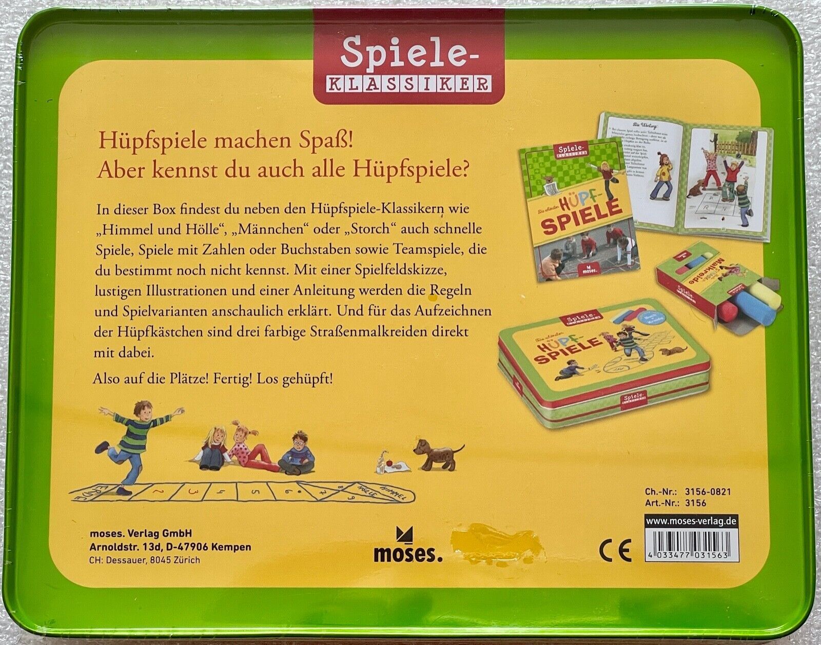 Spieleranzahl: 2 bis 6 Spieler Spieldauer: 30 Minuten Altersempfehlung: 6 + Spiele-Klassiker - Die schönsten Hüpfspiele In der Hüpfspiele-Box finden sich neben den Klassikern auch schnelle Spiele, Teamspiele und Spiele mit Buchstaben oder Zahlen. Mit einer Spielfeldskizze, lustigen Illustrationen un