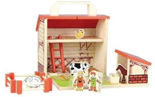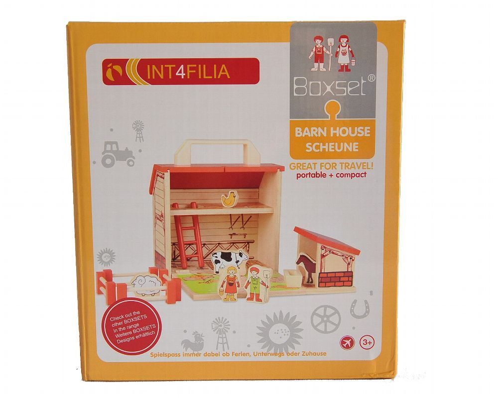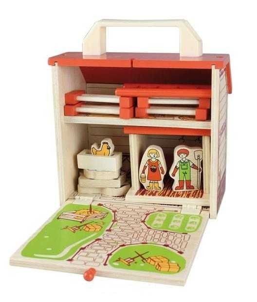 - Inhalt: Holzbox Scheune, Pferdestall, Leiter, 4x Weidezaun, Futtertrog, Figuren: Bauer, Bäuerin, Kuh, Pferds, Huhn, Schaf.