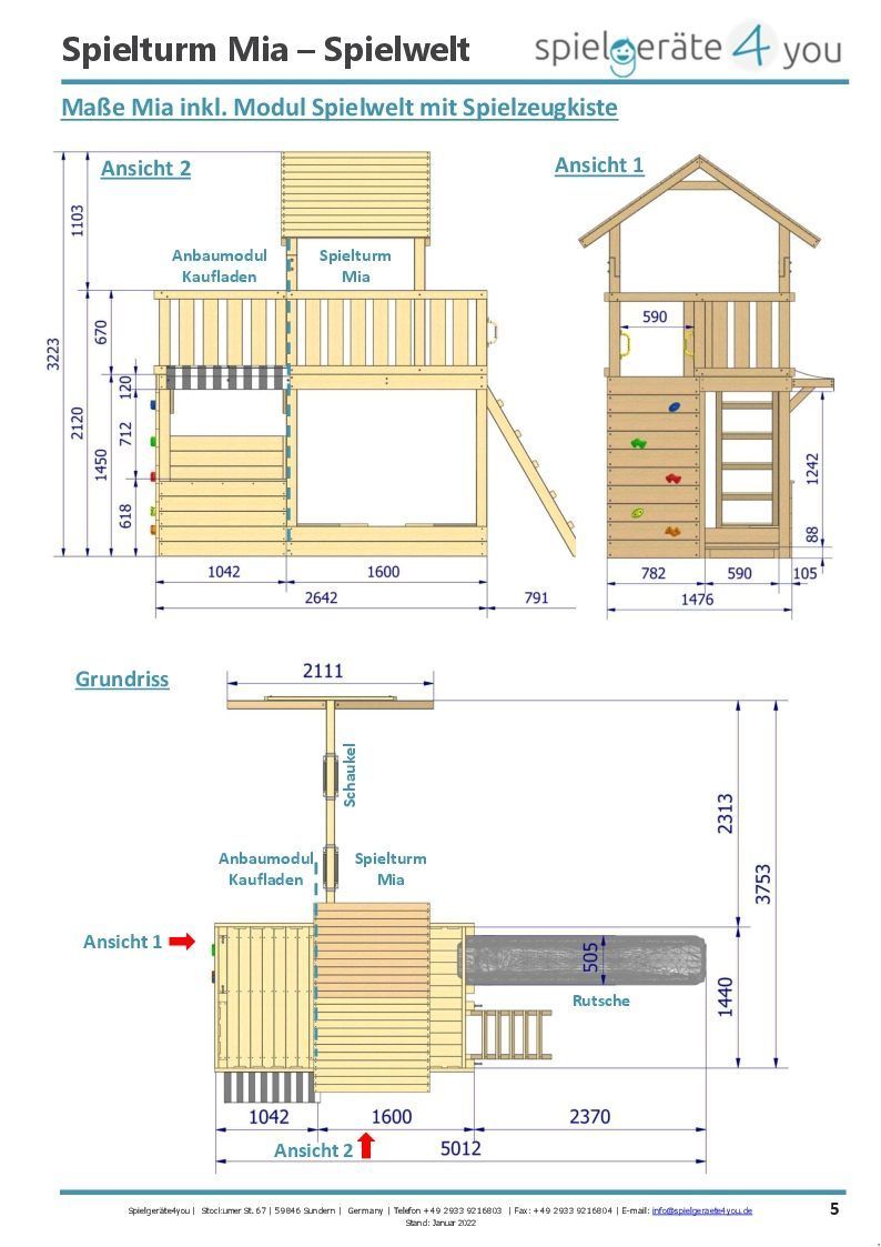 Spielturm Mia – Spielwelt – 363 - natürlich Lärchenholz mit roter Rutsche