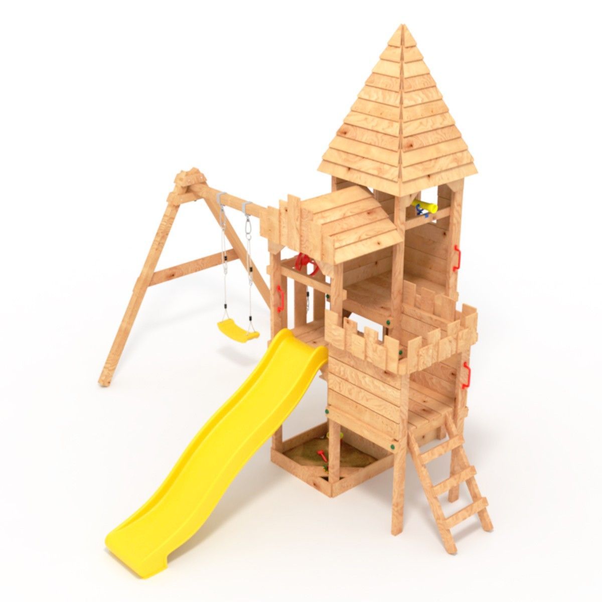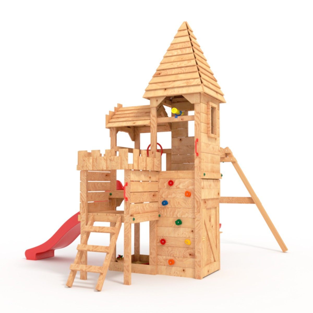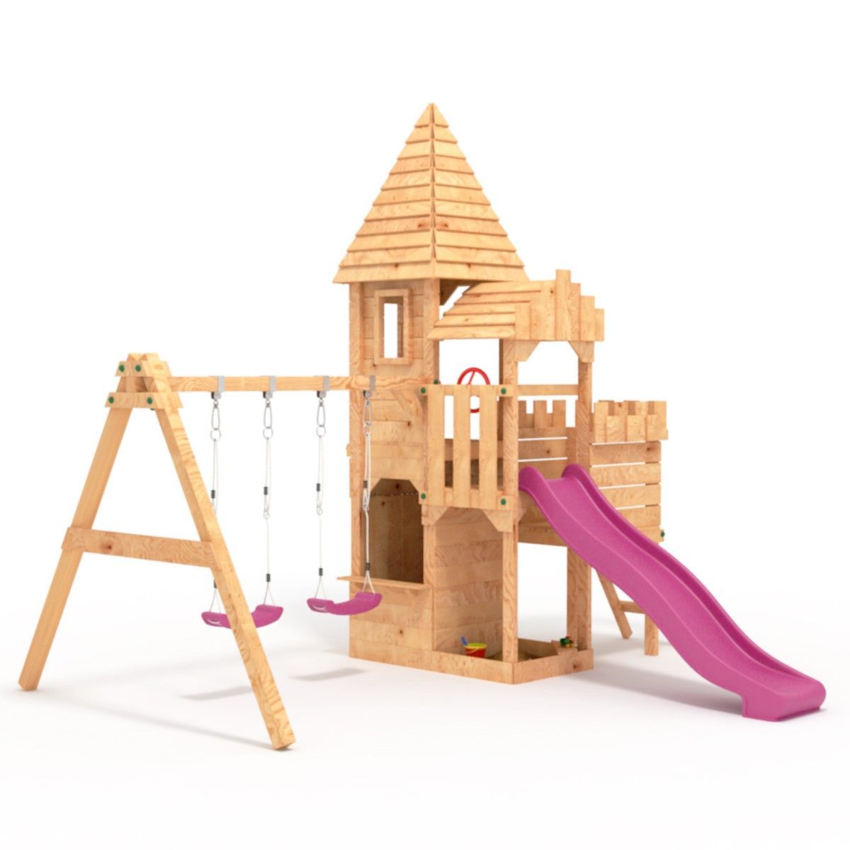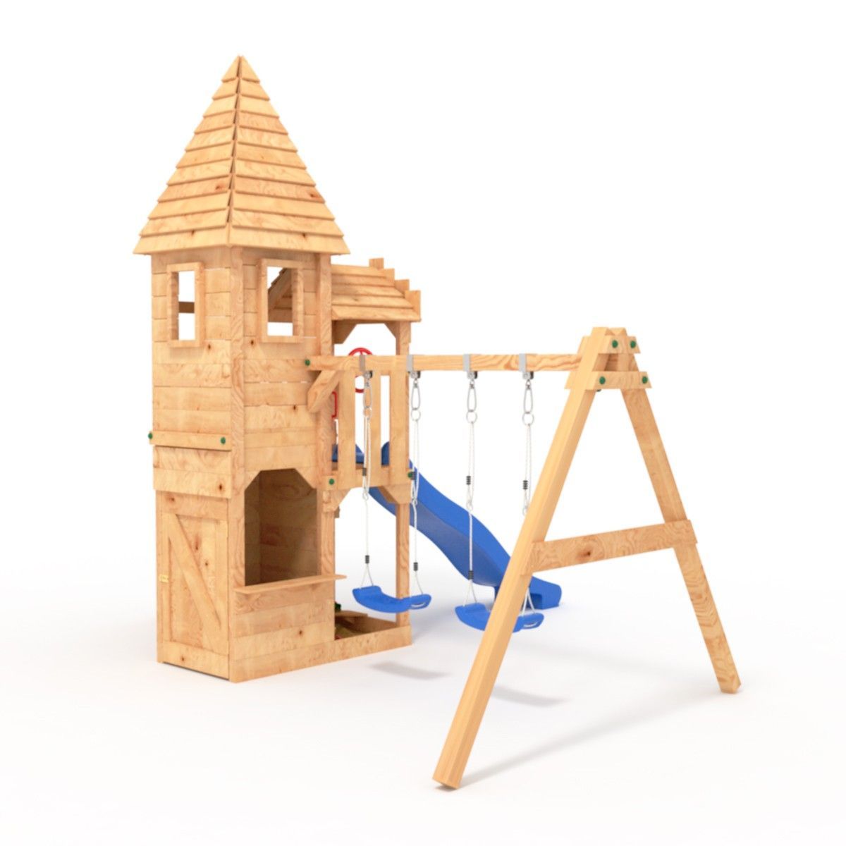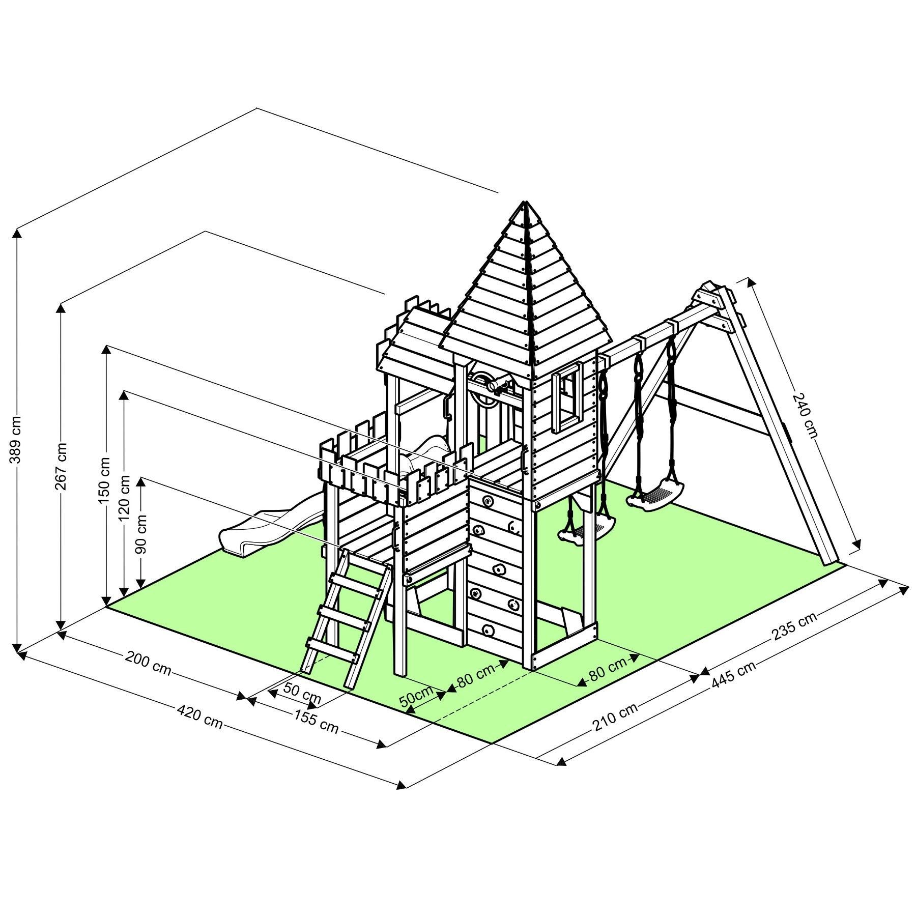 Spielturm - Ritterburg "L120" + Rutsche, 2xSchaukel, Klettersteine