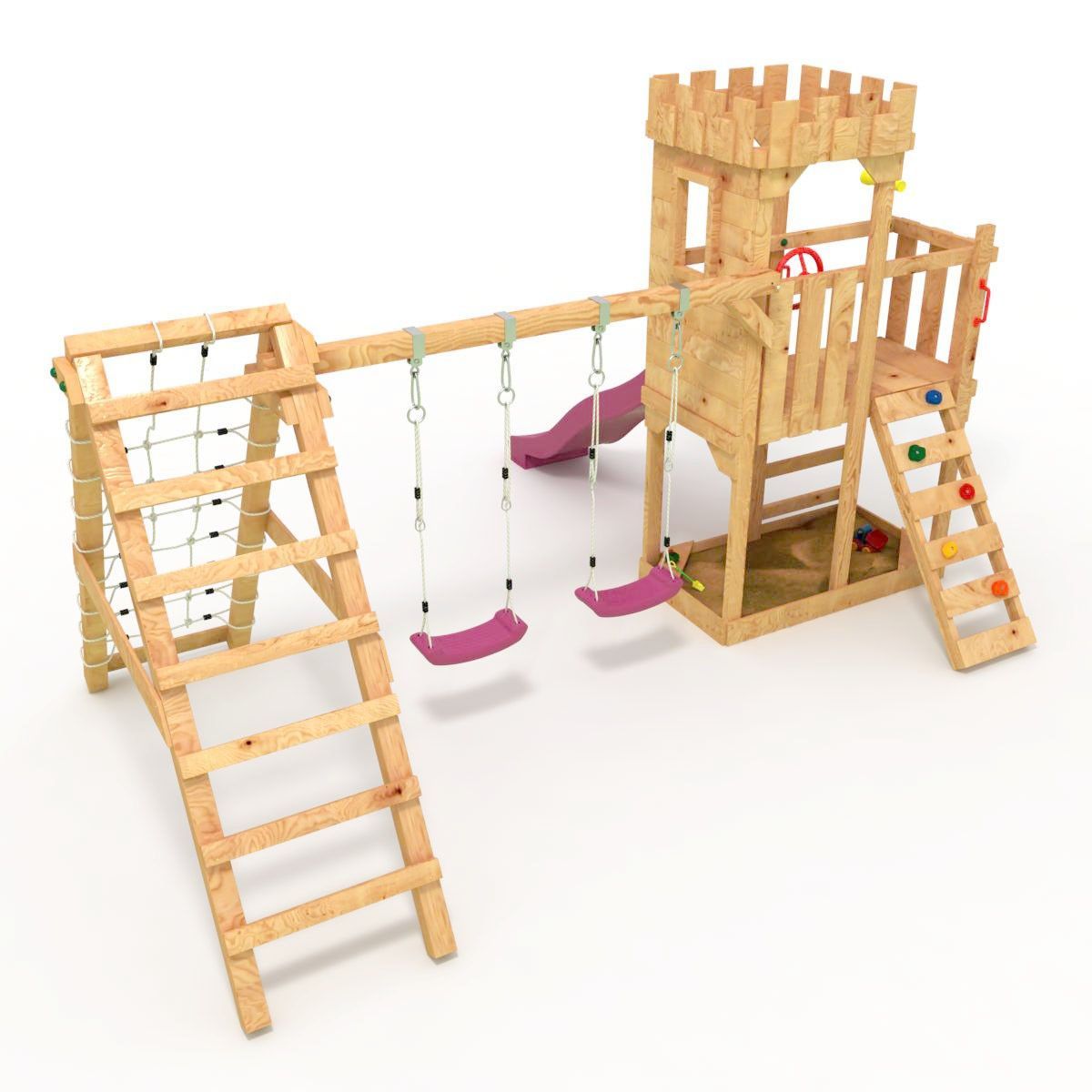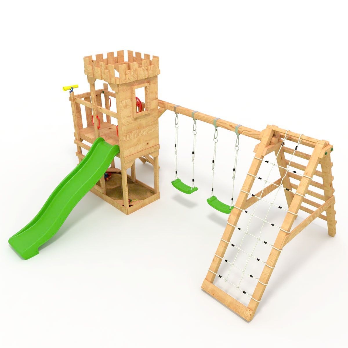 Spielturm - Ritterburg "XL120" - 2x Klettertürme + Spitzdach, 2x Schaukel + Netz