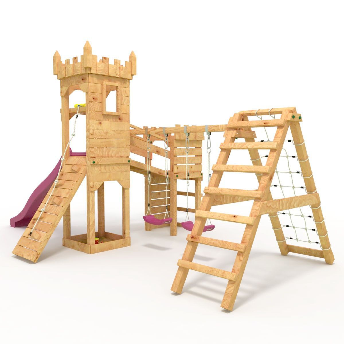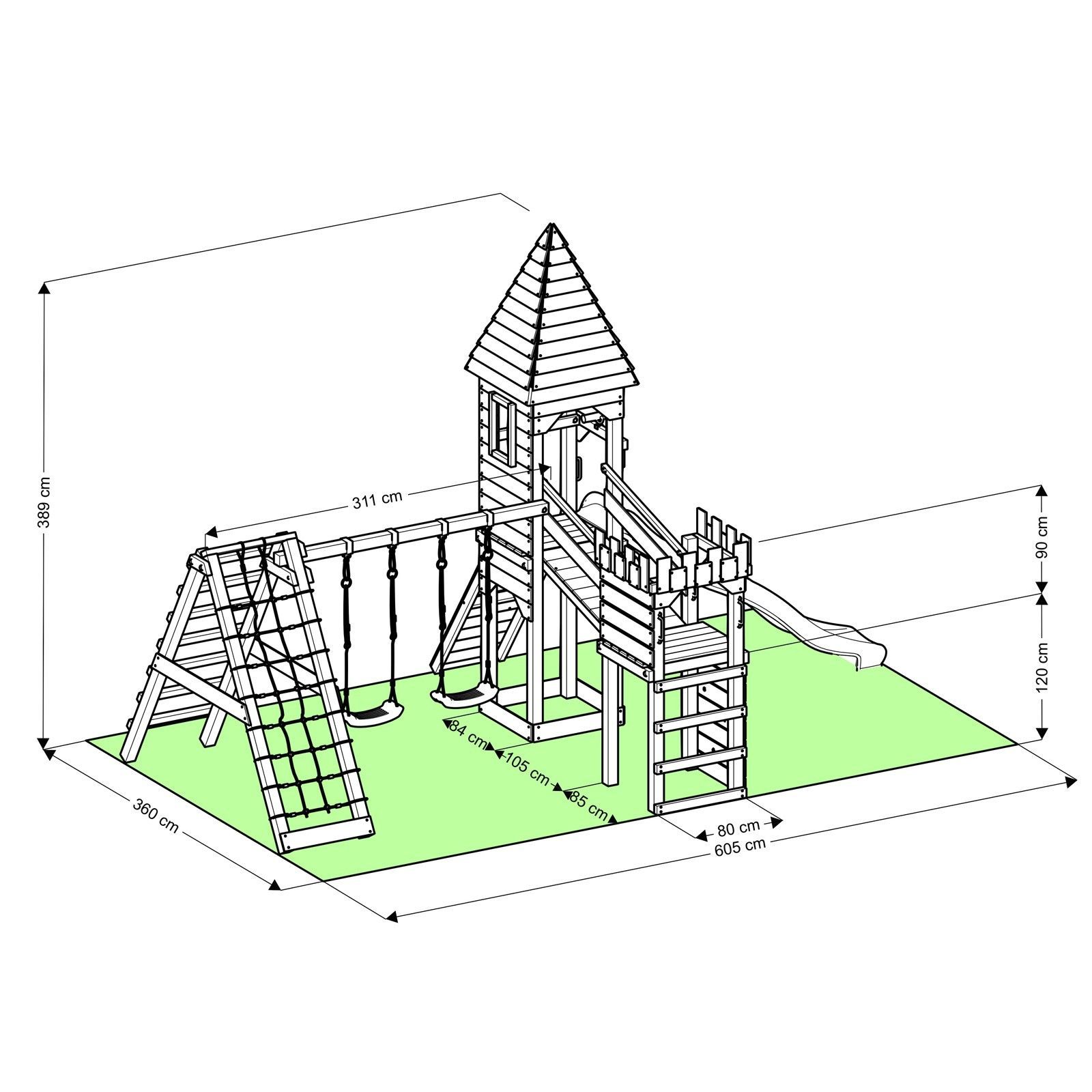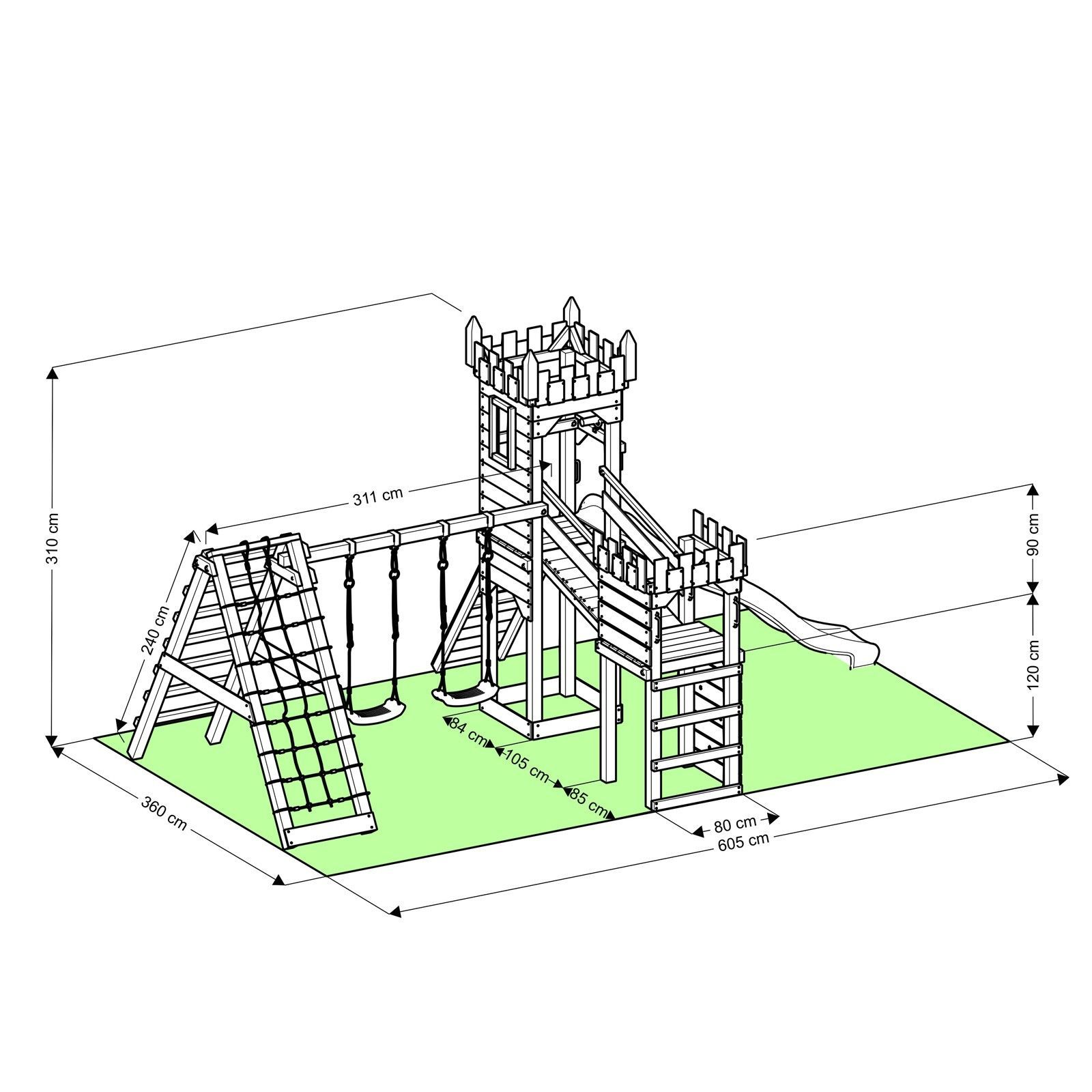 Spielturm - Ritterburg "XL150" - LANGE Rutsche, 2x Türme, 2x Schaukel + Knotennetz