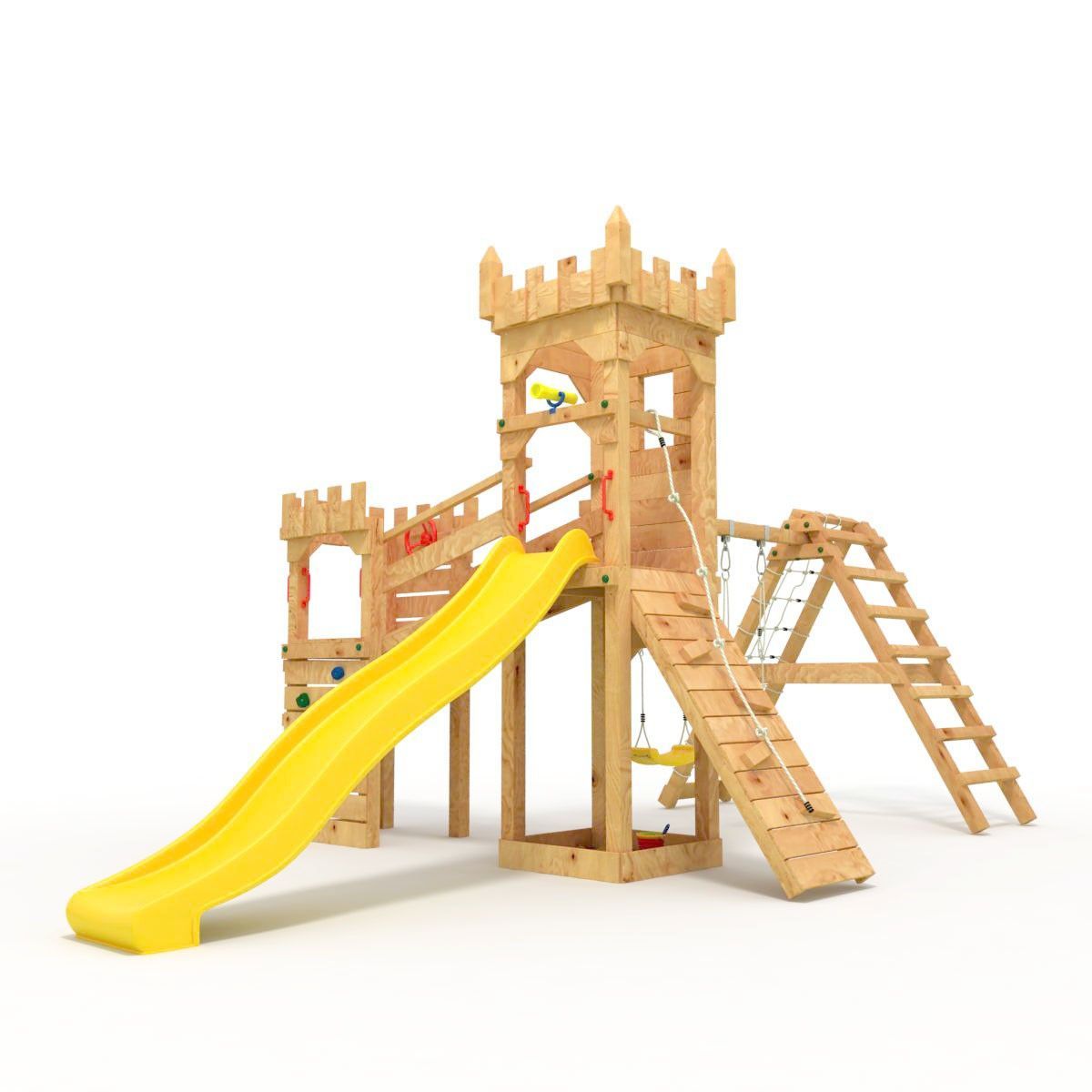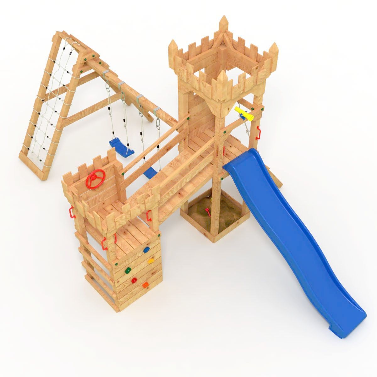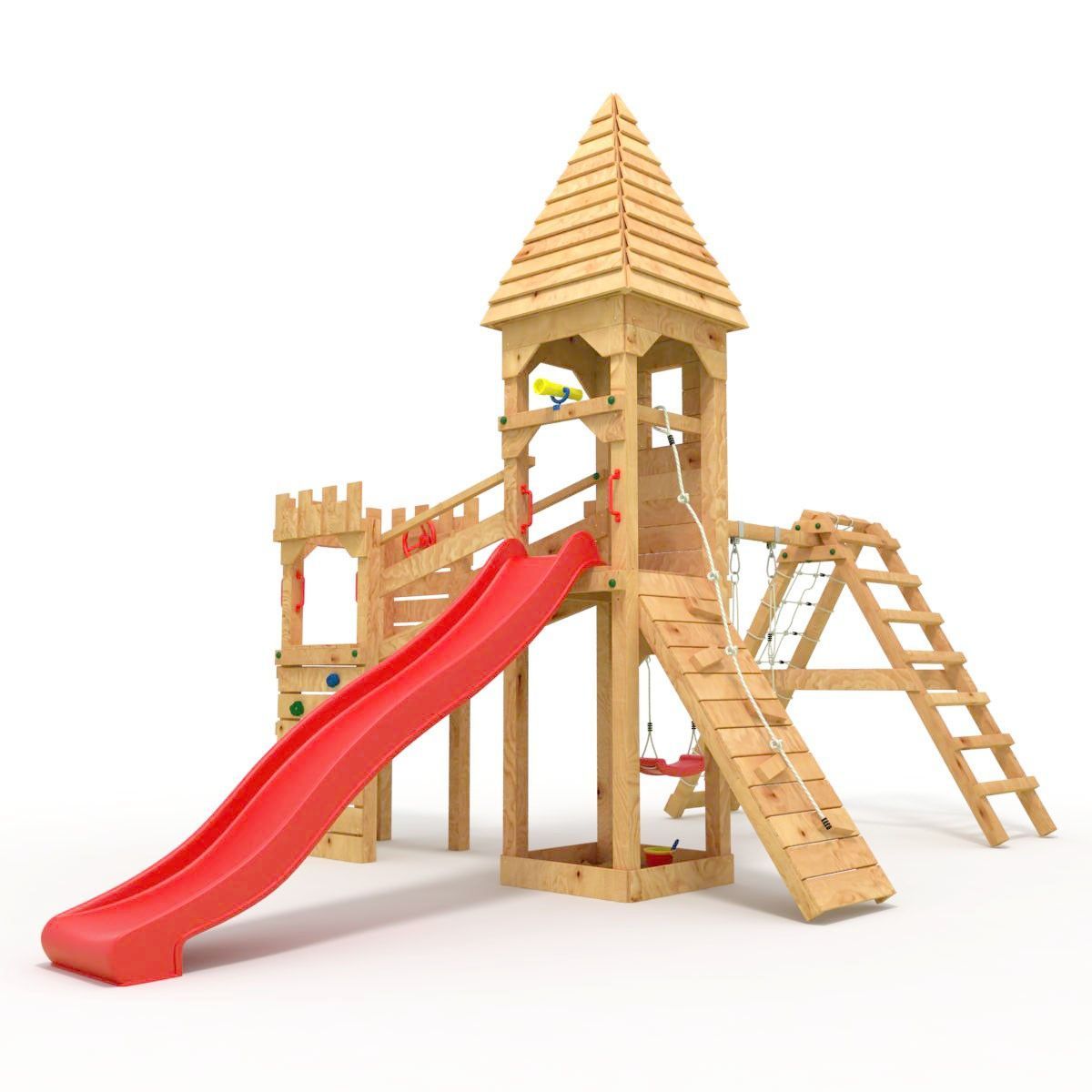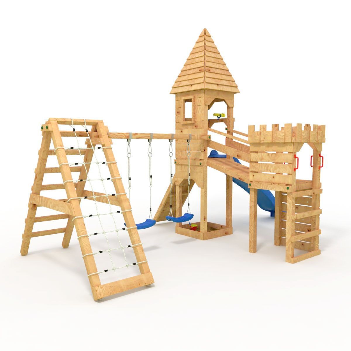 Spielturm - Ritterburg "XL150" - LANGE Rutsche, 2x Türme, 2x Schaukel + Knotennetz