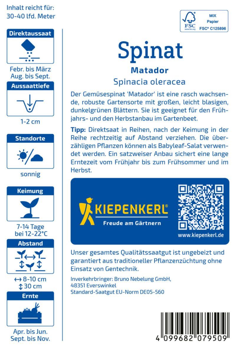 Kiepenkerl Spinat Matador, großblättriger Gemüsespinat - Frühjahrs- und Herbstanbau,