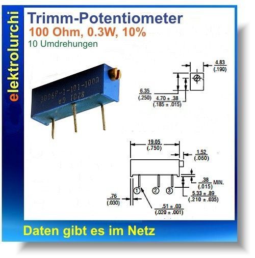 Spindeltrimmer 100 Ohm, 10-Gang, linear, Trimmpotentiometer 0,3W, 10%, 2St.