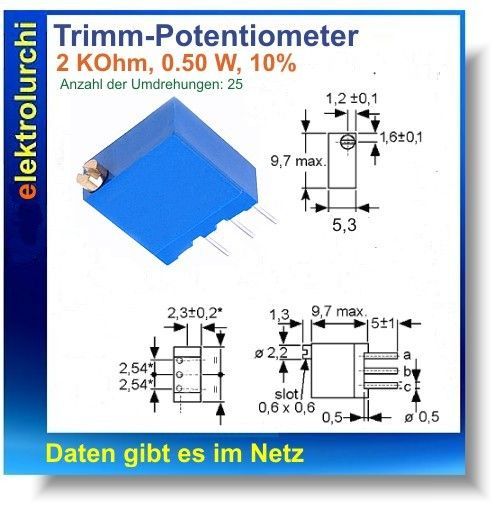 Sie bieten hier auf folgenden Artikel 3 Stück Spindeltrimmer 2K Ohm, 25-Gang, linear, Trimmpotentiometer 0,5W, 10% Technische Daten Produktart: Spindeltrimmer Widerstand: 2K Ohm Umdrehungen, Multiturn: 25 Nennlast: 0,5 Watt Toleranz: 10% Ausführung: Stehend Teilung: linear Temperatur: -55 - +125 °C