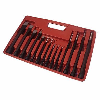 14tlg. Treiber- und Meisselset aus gehärtetem Chrom-Vanadium Stahl - schwarz lackiert (mit extra breitem Schlag). gehärteter Chrom-Vanadium Stahl extra grosse Schlagfläche solide Verarbeitung Lieferumfang 14x Treiber und Meissel 5x Flachmeissel(25 x 215, 22 x 200, 18 x 170, 15 x 175 & 12x 150 mm