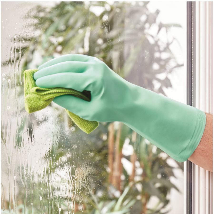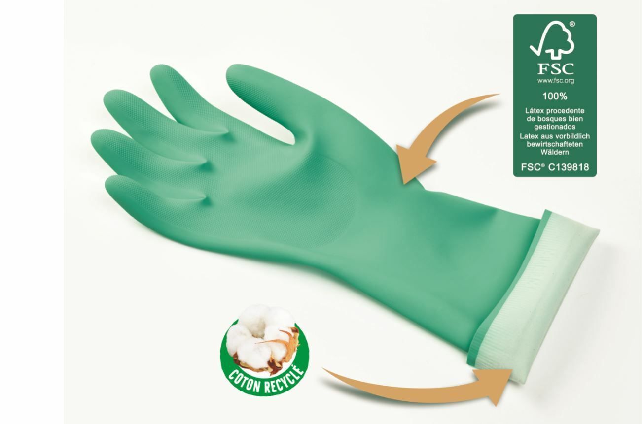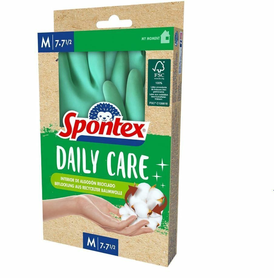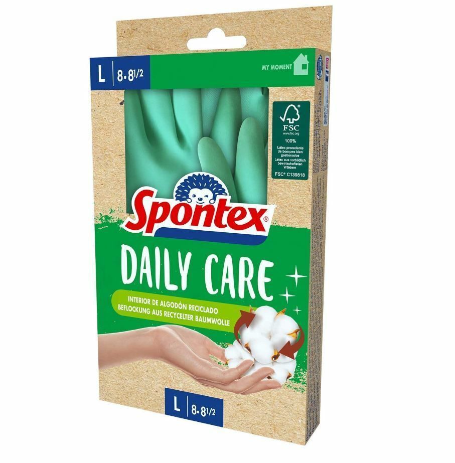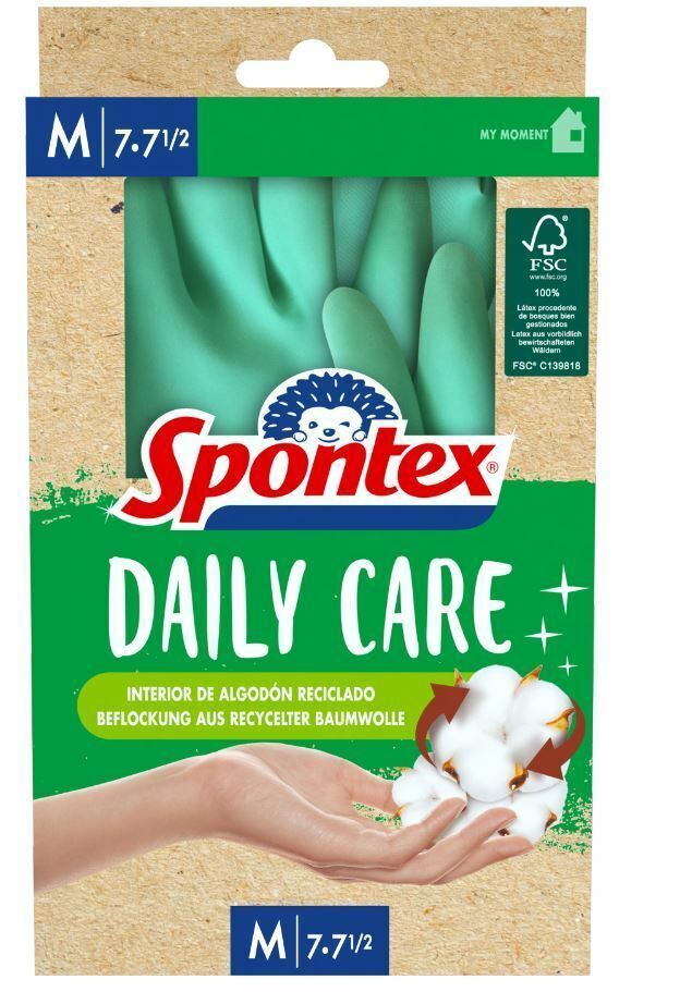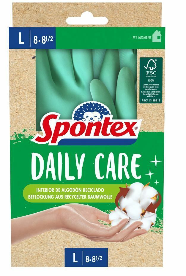 Spontex Daily Care Tägliche Sorgfalt für Hände und Umwelt Haushaltshandschuh aus 100% FSC-zertifiziertem Latex aus vorbildlich bewirtschafteten Wäldern Beflockung der Innenseite aus 100% natürlicher,recycelter Baumwolle Verpackung aus recyceltem Karton Besonders hoher Tragekomfort und ausgezeichnete