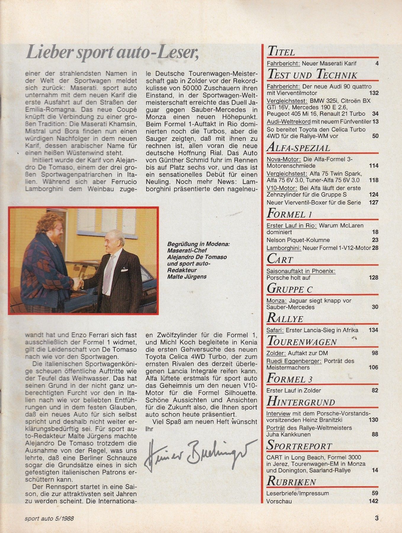 sport auto 5 1988 Fahrbericht: Maserati Karif Der neue Audi 90 quattro Vergleich: BMW 325i, Citroen BX GTi 16V, Mercedes 190 E 2.6, Peugeot 405 Mi 16, Renault 21 Turbo Alfa Rormeo Spezial Formel 1: Rio, Lamborghini Motor Nelson Piquet Kolumne Cart in Phönix Gruppe C Monza Rallye Safari - Porträt Juh... Mehr