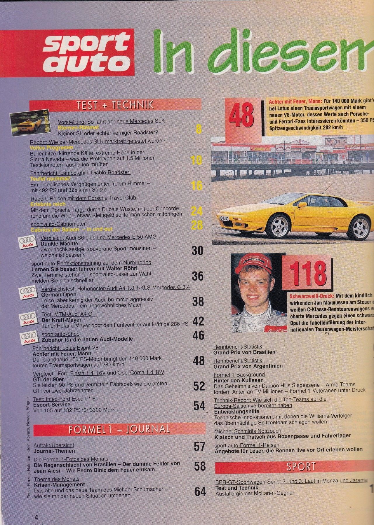 sport auto 5 1996 Test: Mercedes SLK Audi Tuning A4, A6, A8 Fahrbericht: Lotus Esprit V8 Lamborghini Diablo Roadster Formel 1 Rennen Brasilien, Argentinien Damon Hills Siegesserie BPR-GT Sportwagen Monza und Jarama Tourenwagen Hockenheim Rallye Safari uvm... Mehr
