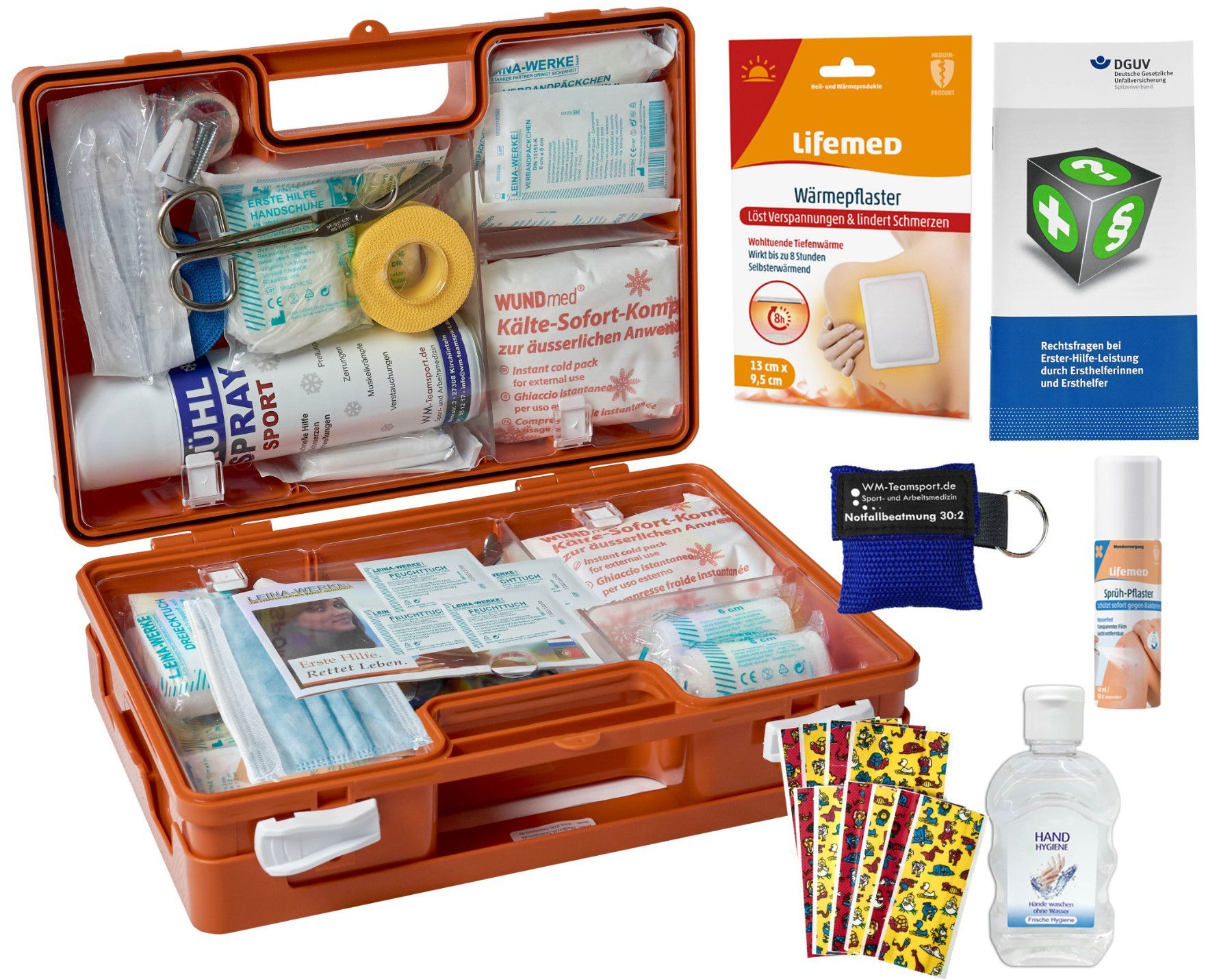 Kompakte erste Hilfe nach aktueller DIN-Norm & Sportausstattung & Wärmepflaster + schlagfester & bruchsicherer Koffer + inkl. Gummidichtung & Wandhalterung + Inhalt nach DIN 13164 & DIN 13157 + inkl. Erste-Hilfe-Anleitung + 2x Kälte-Sofort-Kompressen + Kältespray + Hygiene-Gel, Sprühpflaster & Notfallbeatmungshilfe + 2x Sporttape & NEU - 1x Fingertape + NEU - inkl. Kinderpflasterset + u.v.m.