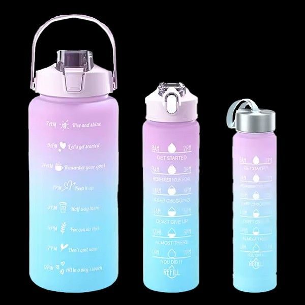 Die 280 ml Trinkflasche mit hochwertigem Metall-Schraubverschluss vereint Funktionalität und Stil. Die 750 ml Trinkflasche mit klappbarem Trinkverschluss und integriertem Strohhalm ist der perfekte Begleiter für den Sport. Die 2000 ml Trinkflasche mit klappbarem Trinkverschluss, integriertem Strohhalm und praktischem Tragebügel ist die ideale Wahl für unterwegs. Im praktischen 3er Set erhalten Sie je eine Trinkflasche in den Größen 280ml, 750ml und 2000ml zum günstigen Setpreis.
