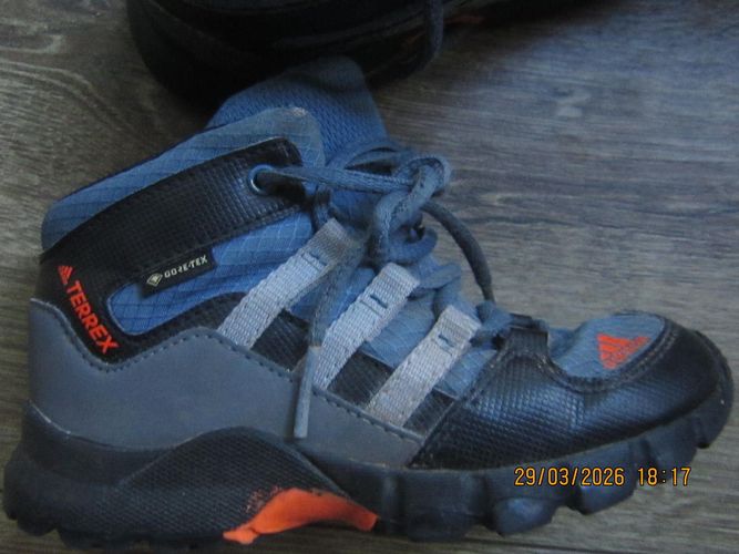 Dieser Schuh ist ein adidas Terrex Mid Gore tex Wanderschuh für Kinder , der durch eine wasserdichte und atmungsaktive Gore_Tex Membran trockene Füße bei jeden Wetter garantiert . Der Schuh ist größe 25