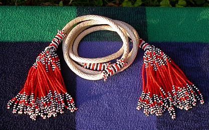 Springseil, Hüpfseil mit Perlenfransen Es besteht aus einem festen Seil mit etwa 7,5 mm Durchmesser. Eine kleine Kostbarkeit wird es durch die mit kleinen Perlen besetzten Fransen. Am Ende sind jeweils zwei Fransen miteinander verbunden. Auch zwischendrin ist das Seil an zwei Stellen mit Perlen verz