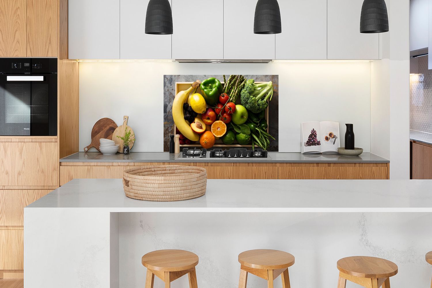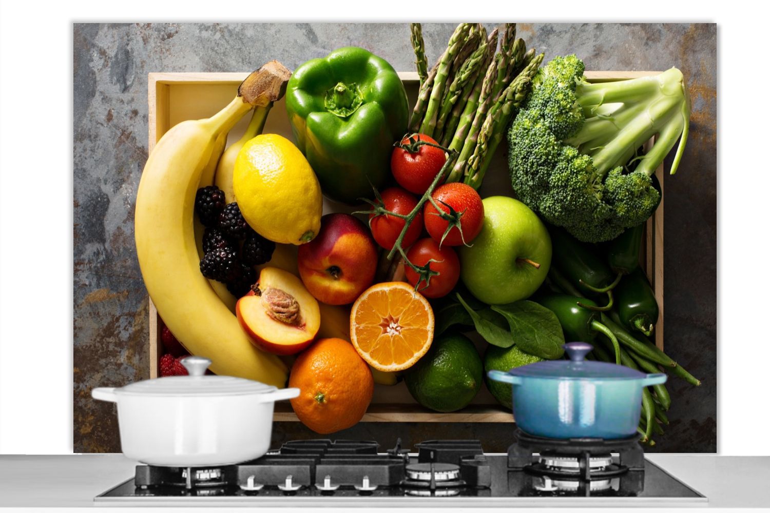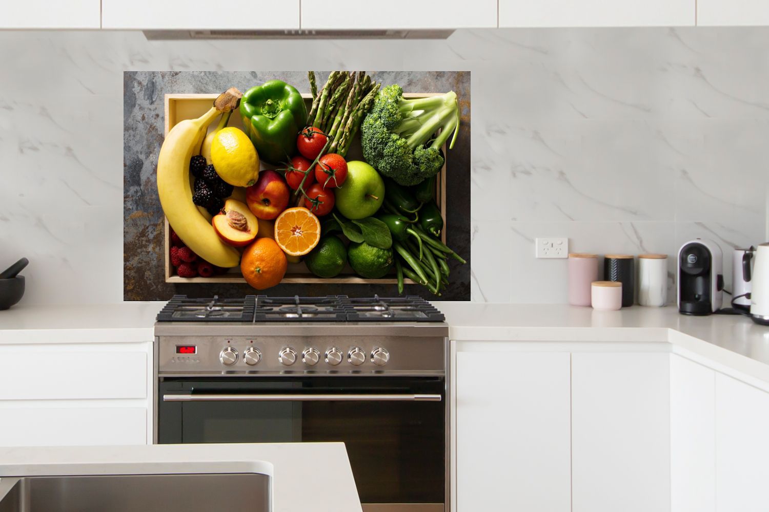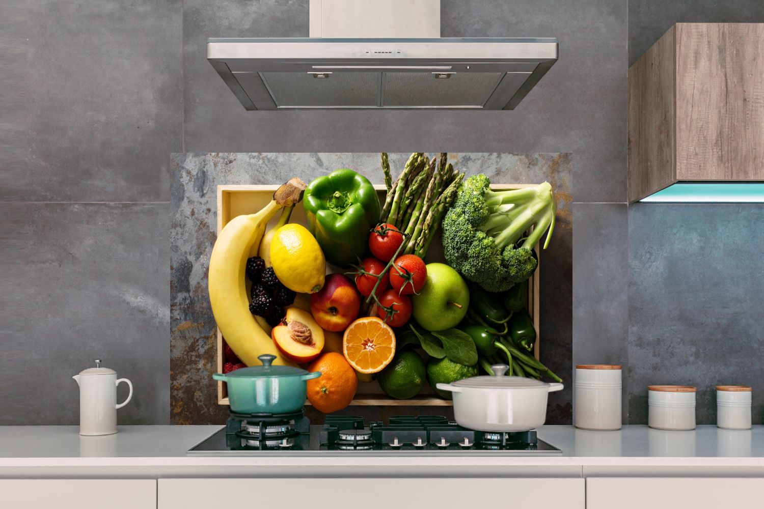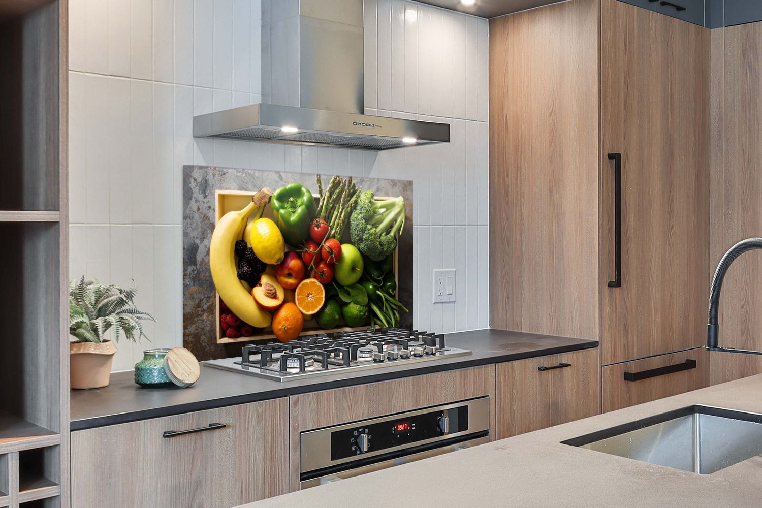 Spritzschutz Küchenrückwand - 120x80 cm Kiste - Obst - Regenbogen (Gr. 120x80 cm)