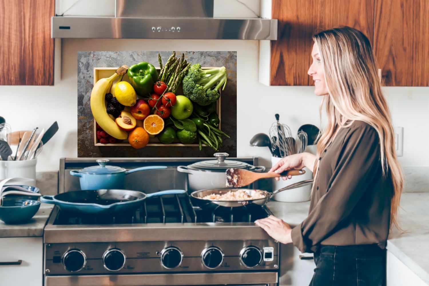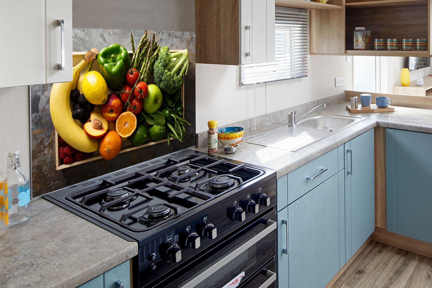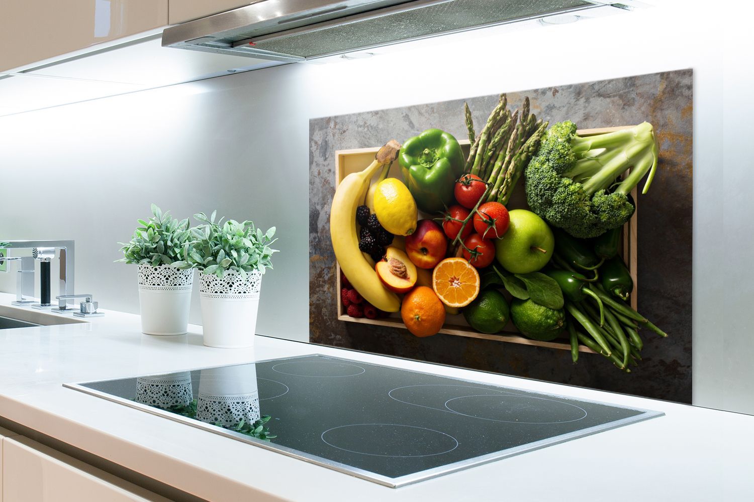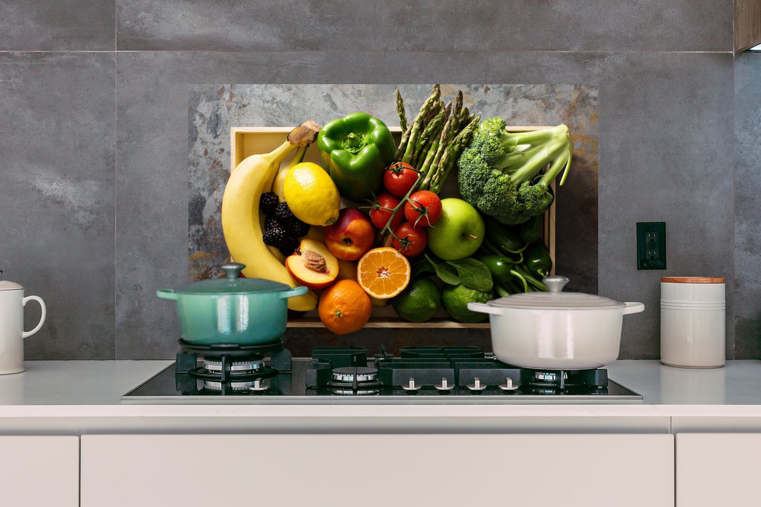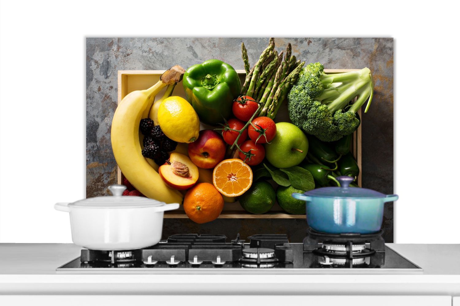 Spritzschutz Küchenrückwand - 80x55 cm Kiste - Obst - Regenbogen (Gr. 80x55 cm)