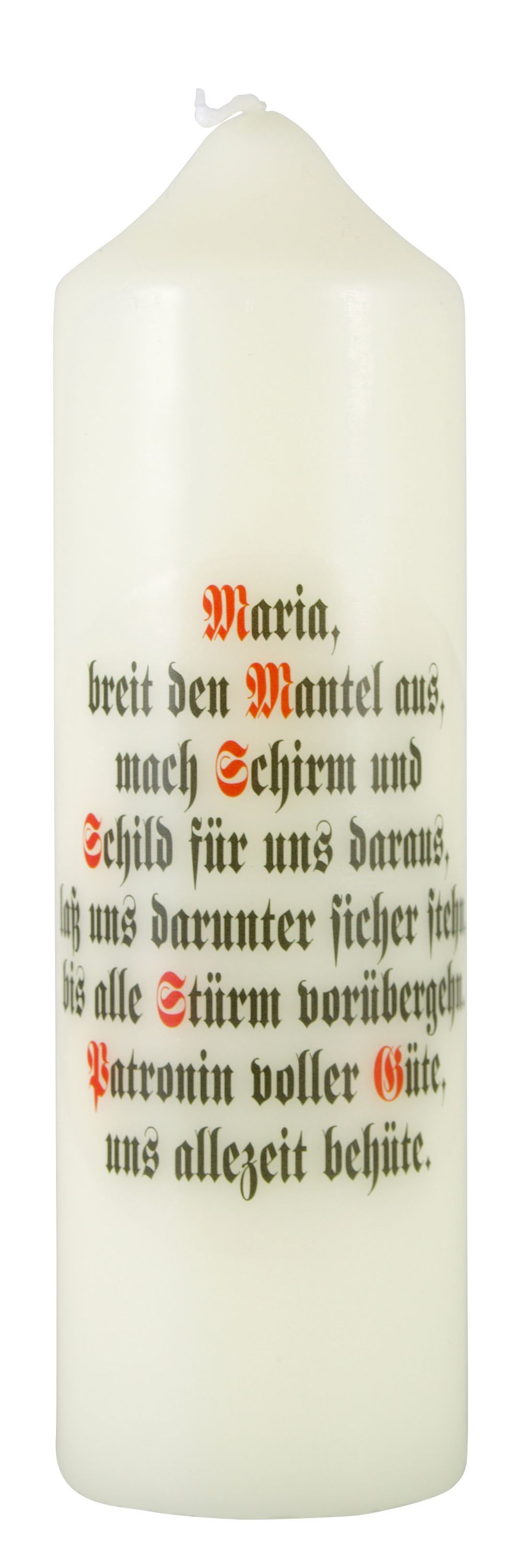 schön gestaltete Spruchkerze mit Druckmotiv und Text: Maria breit den Mantel aus... Details zum Produkt: Größe: 16,5 x 5cm Material: Wachs