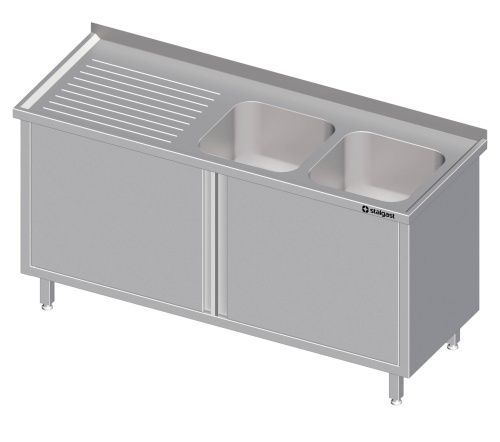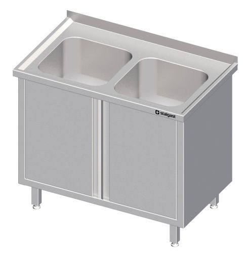 Spülschrank mit Flügeltüren, mit zwei Becken, mit Aufkantung, verschweißt SG19338.0_Master H=850 mm, hergestellt aus rostfreiem, ferritischem Stahl, Aufkantung hinten, 40 mm Höhe, fest verschweißte Ausführung, Materialstärke mindestens 1,2 mm, Becken 1 mm, umlaufender Wulstrand, 19 mm, Abtropffläche... Mehr
