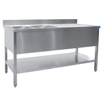 Spültisch Ausführung: Hergestellt aus Edelstahl - Tiefgezogenes Spülbecken B 500 x T 400 mm - 2 Spülbecken links - zusätzliche Ablage mit Ablaufrinnen - mit Aufkantung - Gewicht: 82 kg - Maße: B 1800 x T 600 x H 850 mm