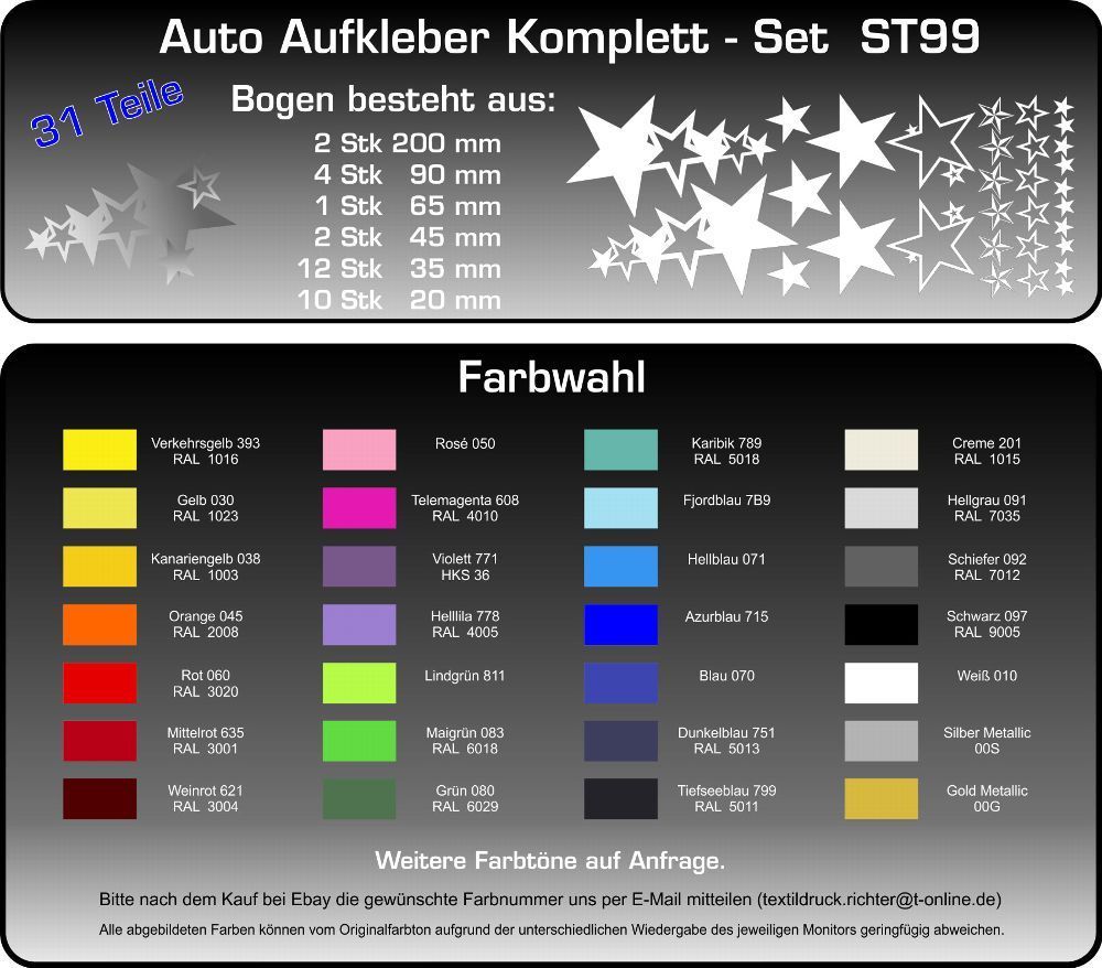 ST99 Autoaufkleber Cartattoo Sterne Klebefolie viele Farben Komplett Set