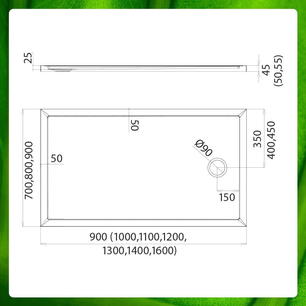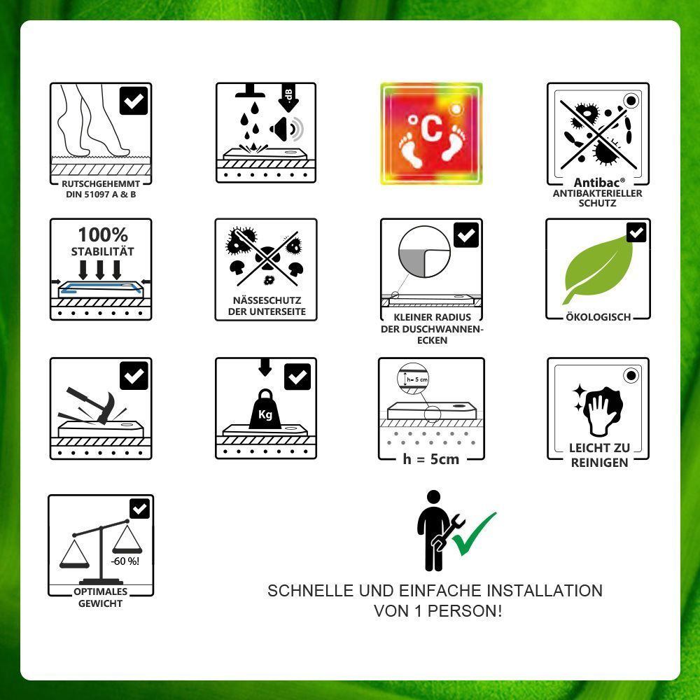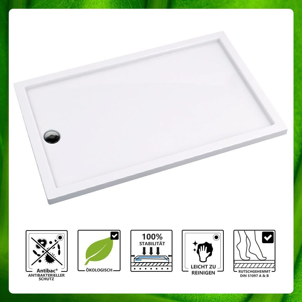 stabile, unzerbrechliche Duschwanne aus Mineralgußverbund - Ablauf an kurzer Seite