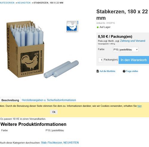 • Stabkerzen aus Paraffin, 180/22 mm, Taubenblau, Kerzenfarm HAHN, Brenndauer ca. 8h, 2