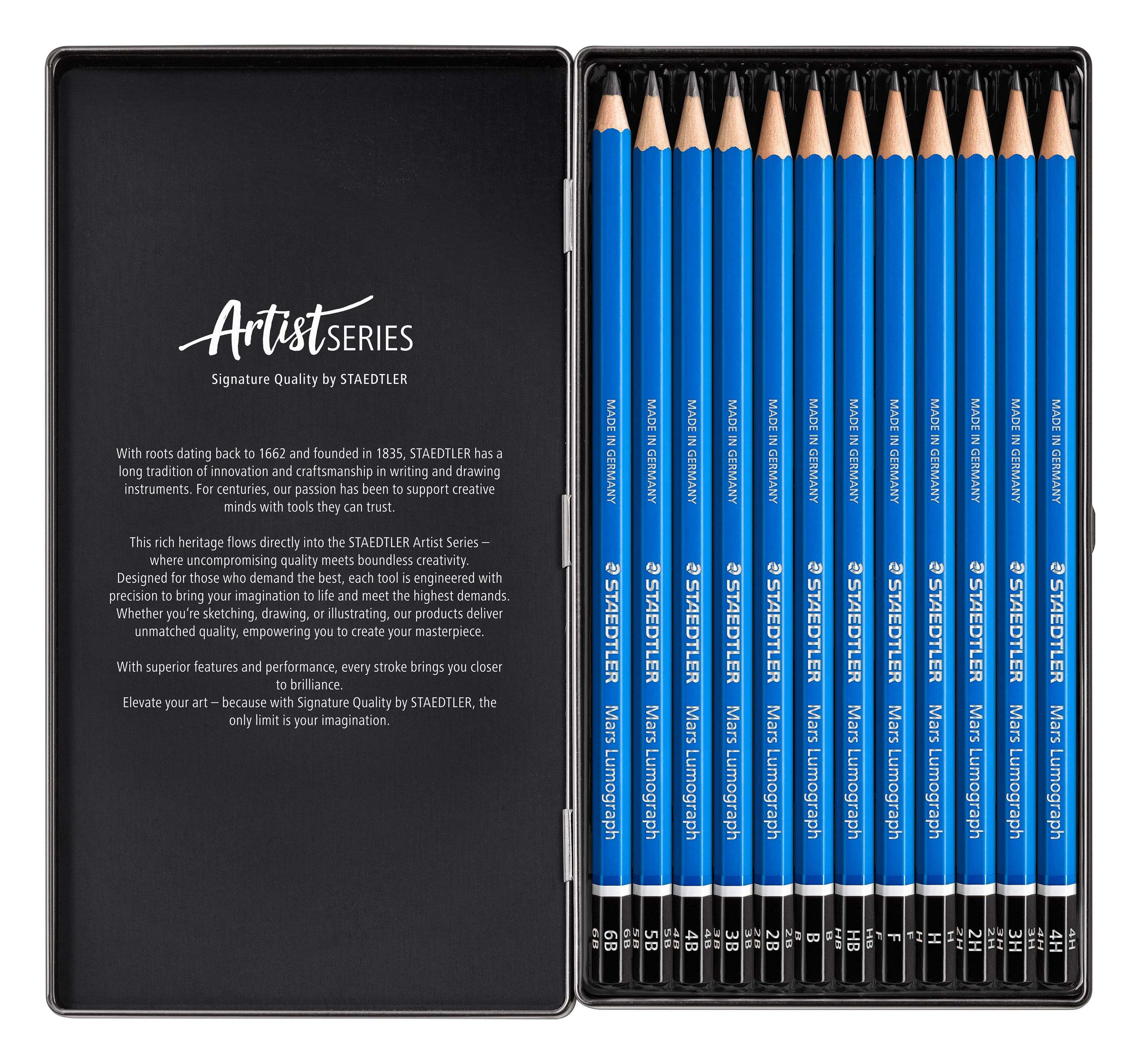 Bleistift (Büro) Mars® Lumograph®, Bezeichnung der Härte: je 1 ST 6B, 5B, 4B, 3B, 2B, B, HB, F, H, 2H, 3H, 4H, blau. Ausführung des Inhalts mit Packung: 12 ST Mars® Lumograph® Bleistifte, sortiert im Metalletui
