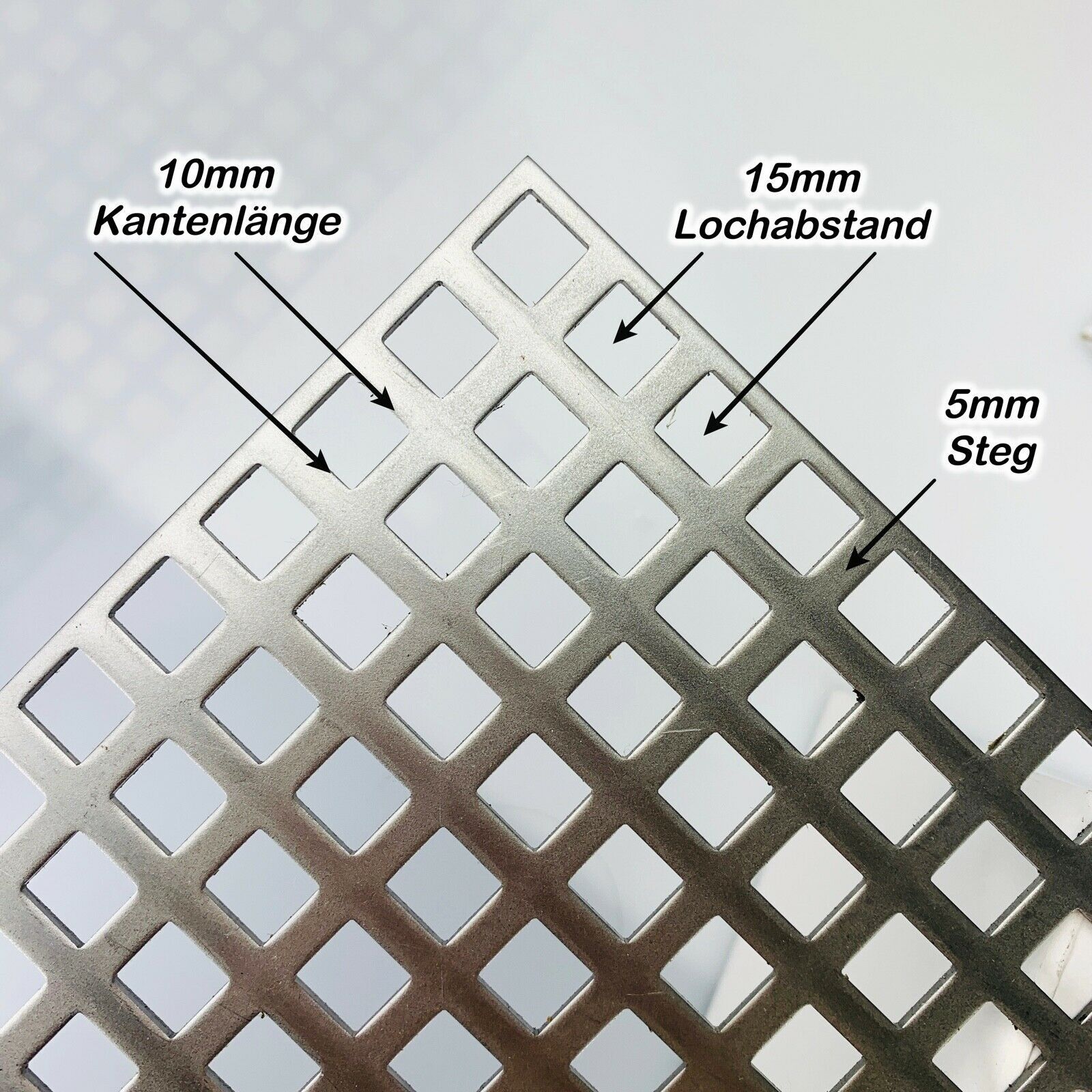Vorteile Innen- und Außeneinsetzbar Rostfrei Stabil und korrosionsbeständig Dank kostenlosem Zuschnitt, vielseitig einsetzbar Einseitig Schutzfolie Kostenloser Rückversand innerhalb von 30 Tagen Material: Stahl verzinkt t=2,0mm Lochbild: QG 10-15 = quadratische Löcher, gerade verteilt, Durchmesser 1