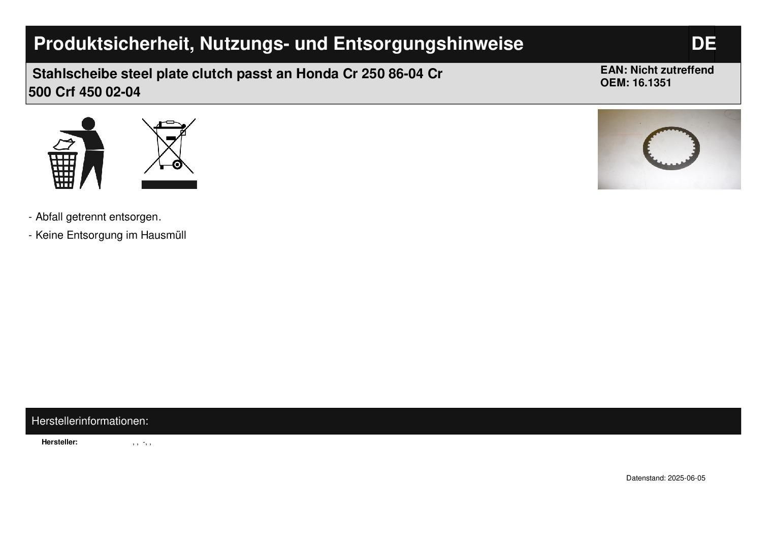 Stahlscheibe steel plate clutch passt an Honda Cr 250 86-04 Cr 500 Crf 450 02-04