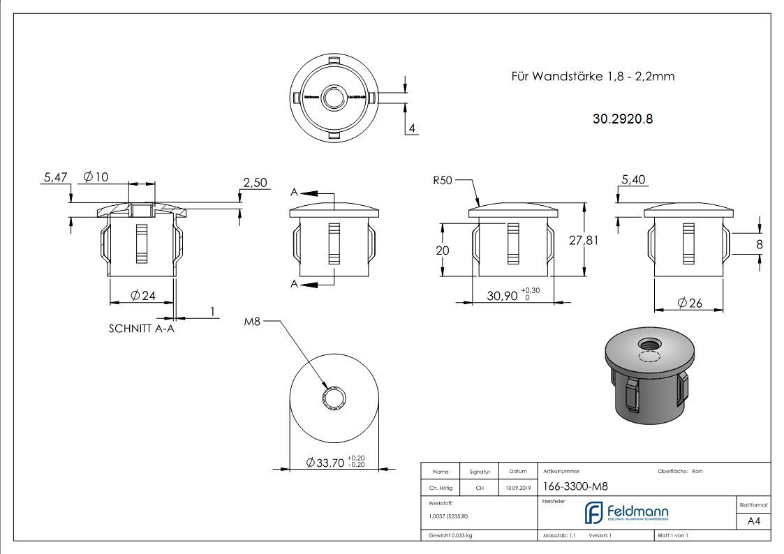 Stahlstopfen | leicht gewölbt | mit M8 | für Rundrohr Ø 33,7x1,8-2,2 mm | Stahl
