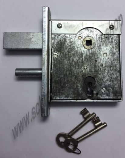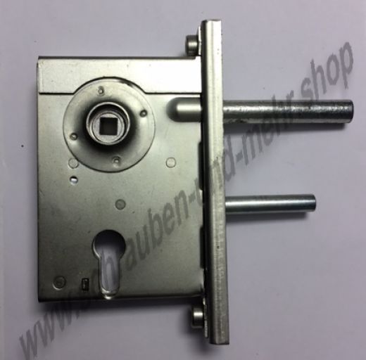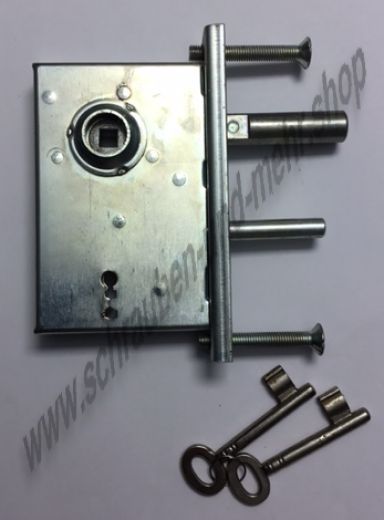 Stahltürschloß, Stahltorschloß Gittertorschloß Nr. 10: Mit 2 Gewindenbuchsen M8, Buntbart mit 2 Schlüsseln, Drückerführungsrosetten Außenmaß Breite: 35 mm Höhe: 130 mm, Breite ohne Stulp: 83 mm, 8 mm Vierkant, 63,2 mm Entfernung, 50 mm Dorn U-Stulp: Breite: 29 x 10 mm, Höhe: 160 mm Falle: Durchmesse