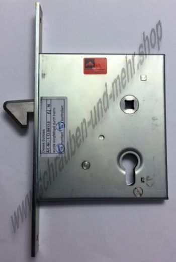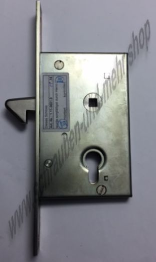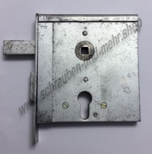 Stahltürschloß, Stahltorschloß, Gittertorschloß Schiebetorschloß mit Wechsel Nr. 14: Buntbart gelocht mit 1 Schlüssel, 2 Gewinde M8, 2 Stück Riegel Höhe: 130 mm, Breite ohne Stulp: 110 mm, 9 mm Vierkant, Entfernung 63,2 mm, 70 mm Dorn Flachstulp: Breite: 30 mm, Höhe: 165 mm Falle: Stärke: 15 mm, Län