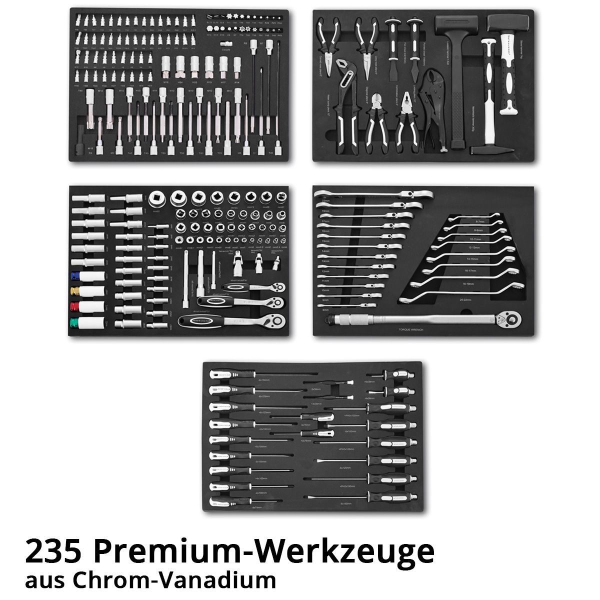 Lieferumfang 1 x STAHLWERK Werkstattwagen SHARK 8 x Ringschlüsselsatz gewinkelt: 6-7, 8-9, 10-11, 12-13, 14-15, 16-17, 18-19, 20-22 mm 10 x Maul Ringschlüssel mit Ratsche (neigbar): 8, 9, 10, 11, 12, 13, 14, 15, 16, 17, 19, 22 mm 1 x 1 2 Drehmomentschlüssel 28-210 Nm 13 x 1 4 CR-V Nüsse: Innensechsk... Mehr