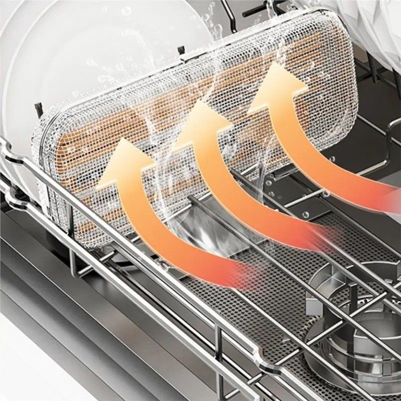 This mesh basket, made from stainless steel, organizes small cutlery and kitchen tools in the dishwasher. It ensures thorough cleaning and acts as a storage box.