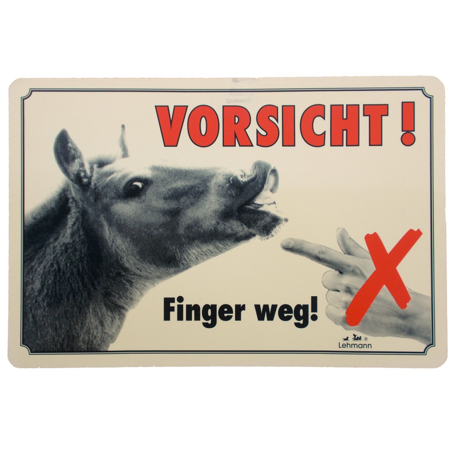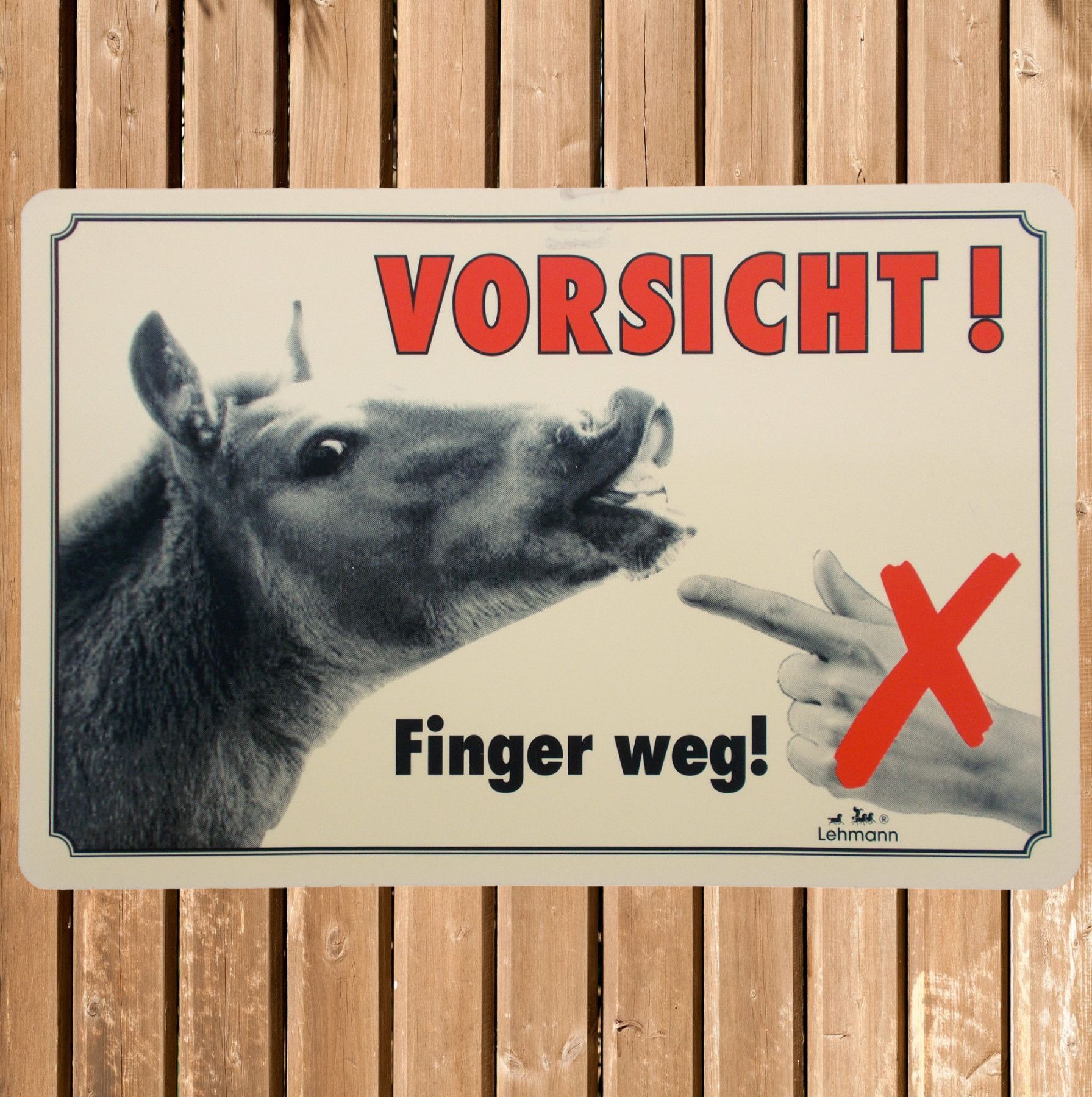 Stalltafel, Hinweisschild · Aufschrift Vorsicht! Finger weg! · Größe: ca. 30 x 20 cm · Material: Kunststoff Bitte beachten! Die Stalltafel ist gelblich und hat einen Farbfehler oben am Rand. Bildschirmfarben können abweichen.