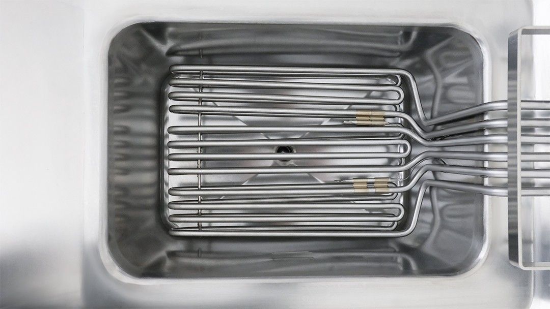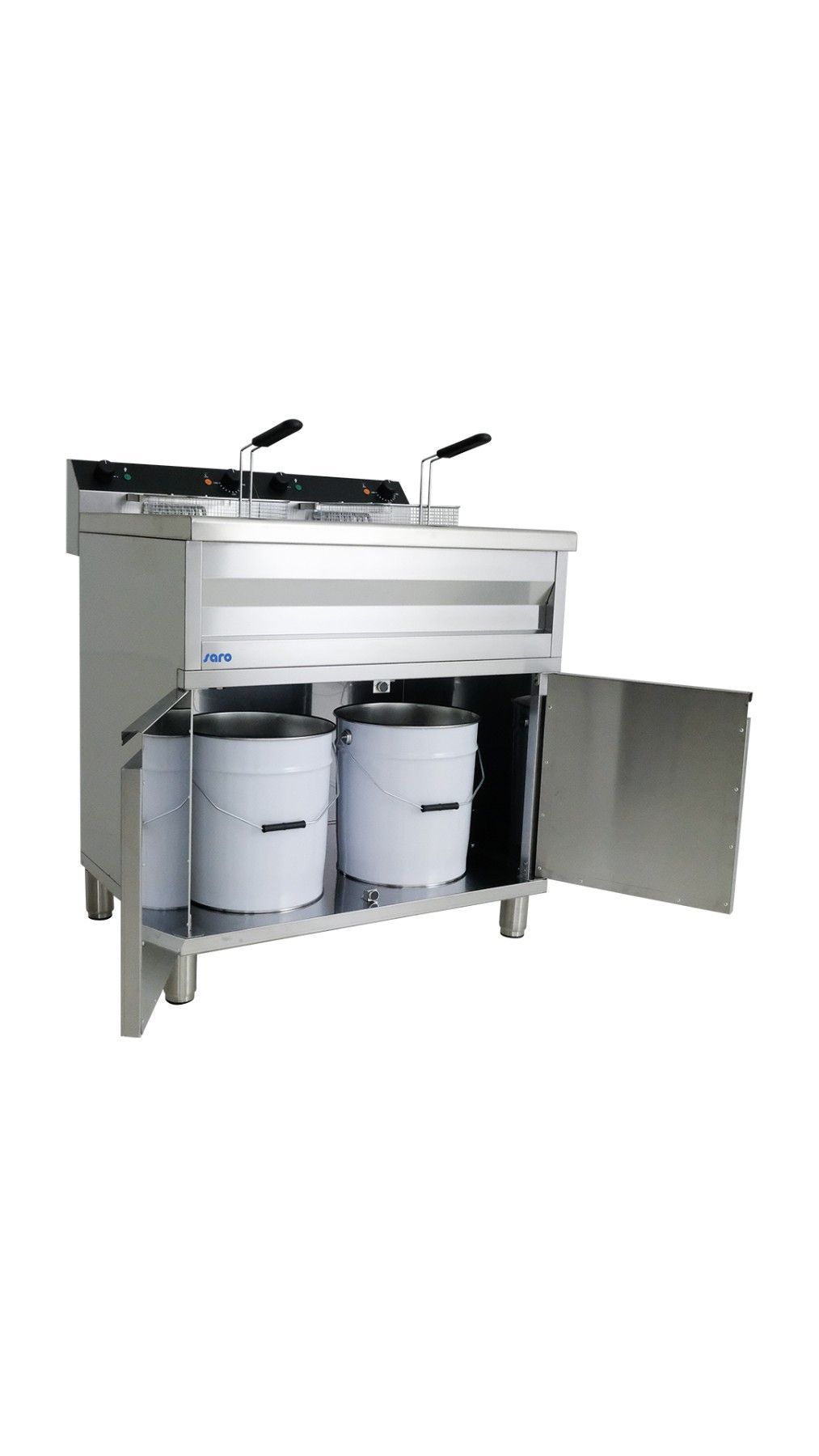 Stand Fritteuse Mod. GASTROLINE 12+12 VS - Material: Edelstahl - Abgerundetes Becken mit Kältezone - Mit Ablasshahn und Edelstahlauffangbehälter - Stufenlose Temperatureinstellung - Herausnehmbare Heizelemente für eine problemlose Reinigung - Ein-/Ausschalter - Sicherheitsthermostat - Gewicht: 59 kg - Maße: B 800 x T 700 x H 950 - Inhalt: 2x 12 Liter - Temp. 0 / +180 °C - Anschluss: 400 V - 50 Hz - 2 x 9 kW