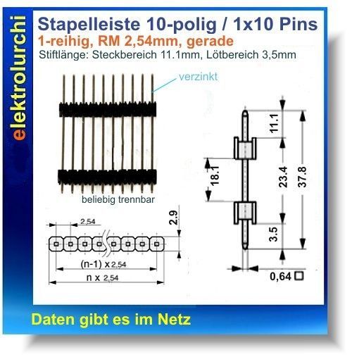 Sie bieten hier auf folgenden Artikel 3 Stück Stapelleiste Stiftleiste 10-polig 1-reihig, Pin gerade, l=37,8mm, RM2.54 vz Kontaktmaterial verzinkt Polzahl: 10-polig Beliebig trennbar Ausführung: 1-reihig, gerade Stiftlänge gesamt: 37.80 mm Stiftlänge Steckbereich: 11.1 mm Stiftlänge Lötbereich: 3.5